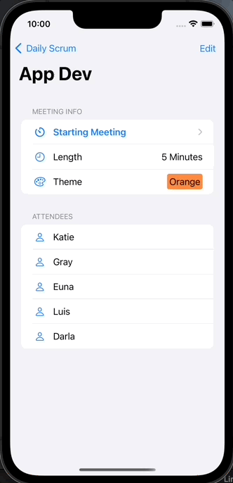 DailyScrum(title: "App Dev", attendees: ["Katie", "Gray", "Euna", "Luis", "Darla"], lengthInMinutes: 5, theme: .orange),