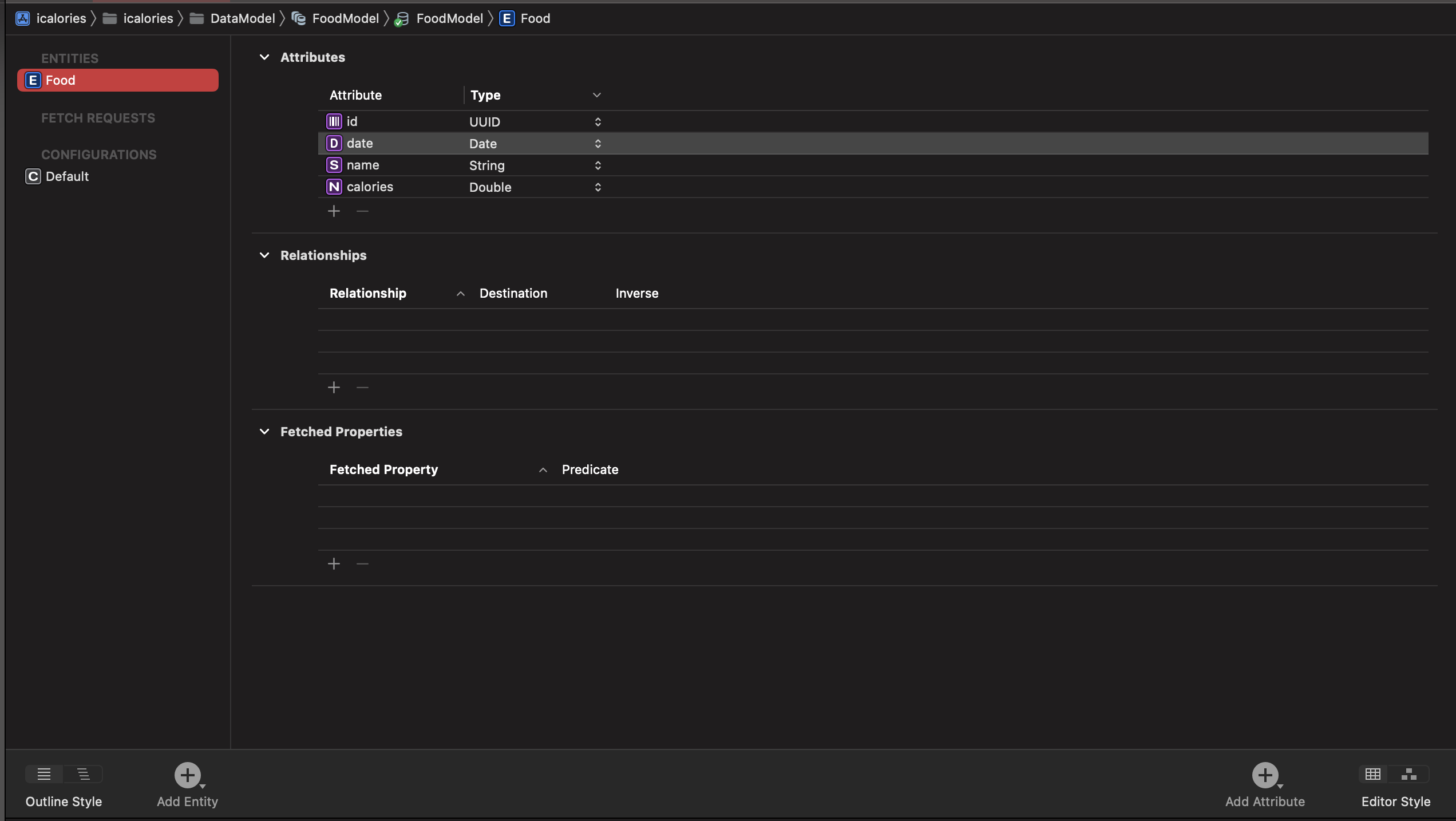 Attribute를 추가해주면서 Food안에 들어갈 id, date, name, calories을 생성하고, 데이터 타입을 선언해준다.