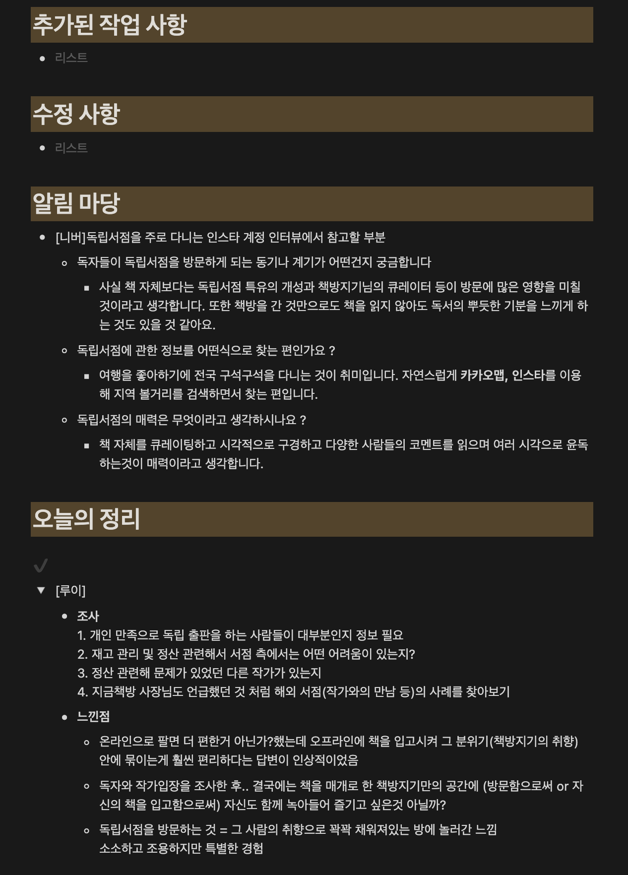 팀 샌들즈의 첫 회의가 시작되었다. 본격적인 기획 회의를 진행하기 앞서, 각자 이번 프로젝트 기간동안 원하는 목표나, 바라는 점과 싫어하는 점들을 얘기하며 팀 문화를 하나씩 만들어갔다. 또한, 독립서점에 관한 개념을 팀원들한테 다시 설명하는 세션을 열었고, 이전에 아이디어 피칭을 준비하며 조사했던 독립서점 문화의 페인 포인트들을 설명하는 시간을 가졌다. (팀원들 모두 아이디어에 흥미가 있어서 합류했지만, '흥미'를 느끼는 수준만으로는 아이디어를 디벨롭하는 과정을 수행하기에는 부족한 부분들이 있었다. 그래서 나는 팀원들이 독립서점 문화에 몰입할 수 있도록 돕는 것이 첫번째 미션이었다.) 내가 준비한 것들을 발표하였고, 보다 심층적인 이해와 몰입을 위해 백문이 불여일견이다는 생각으로 포항과 경주의 여러 독립서점 견학을 다녔다. 우리는 이 문화에 대해 앞으로 3개월 동안 깊게 파고들어야 하기 때문에 초장에 깊은 이해와 흥미를 느꼈으면 좋겠고, 이 문제에 대해 모든 팀원이 가슴 깊이 공감하는 것이 필수라 생각했다.