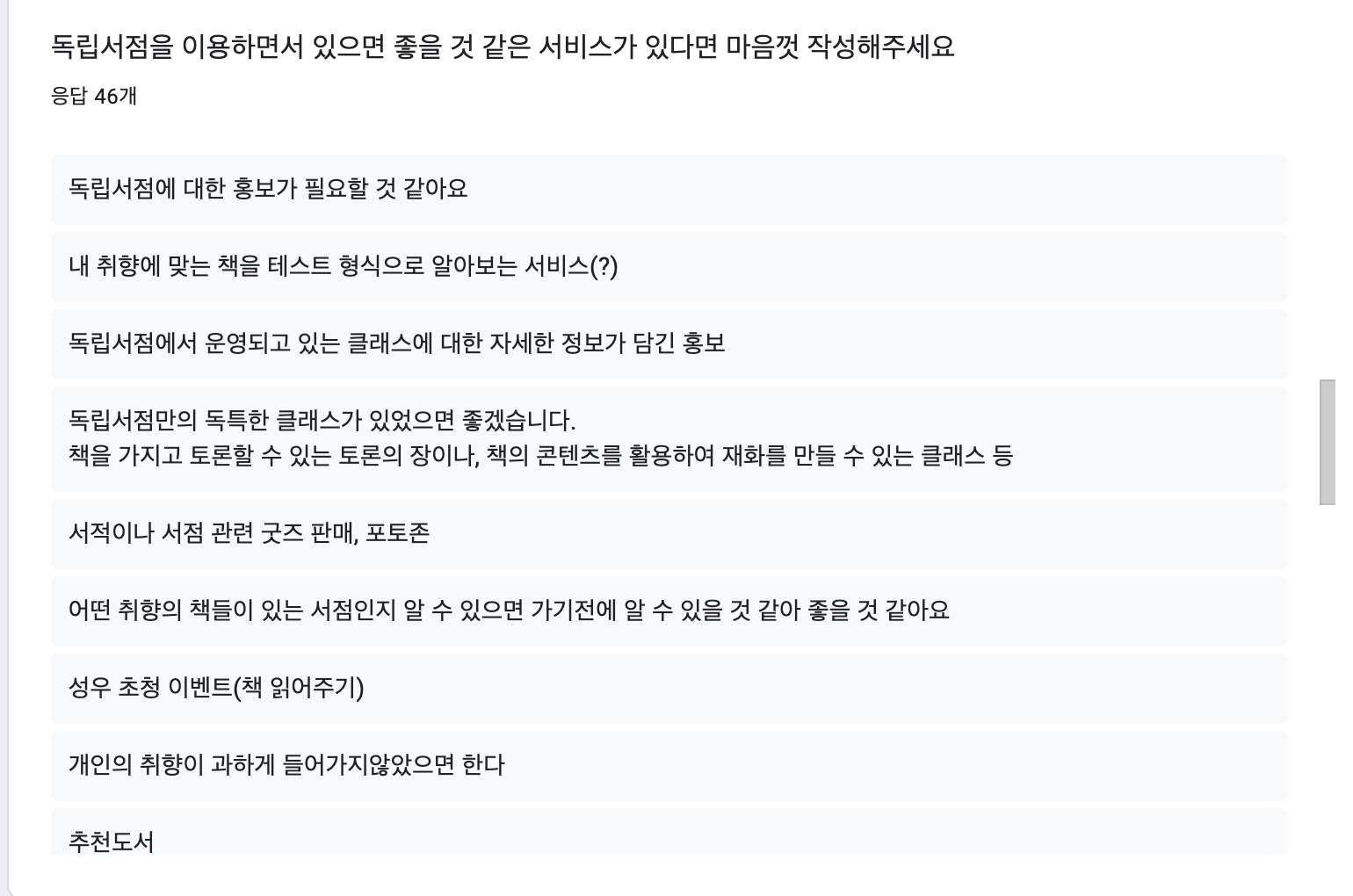 약 3~4일 정도 독립서점을 몸소 체험도 해보고, 서점 점주분들과 얘기를 나눠본 덕에 팀원들 모두 독립서점에 대한 핀트나 주파수를 맞출 수 있었다. 좀 더 정확하고 증명된 페인 포인트를 도출하기 위해서 유저 리서치를 진행했다. (우리끼리 얘기를 나눈 페인 포인트가 '뇌피셜'에 불과하다는 것을 팀원 모두가 동의하였다. 때문에 '진짜' 페인 포인트를 도출하는 과정을 거쳐야 했다.) 독립서점 이용자 나이대, 방문 목적, 정보를 얻는 방법, 클래스 참여 유무, 불편한 점 등을 물어보는 질문지를 작성했고, 독립서점 관련 네이버 카페, 각종 SNS 등 우리의 손이 닿는 모든 곳에 리서치 링크를 뿌려댔다. 그 결과 대략 100분(반올림ㅎㅋ) 정도 리서치에 참여해주셨고, 각자 사비를 털어 7명을 추첨하여 기프티콘을 지급해드렸다. 이렇게 실제 유저들이 느끼는 점들을 페인 포인트로 정리하는 과정을 거쳤고, 이러한 문제들의 임팩트나 현실적인 여건 (우리의 기술 수준으로 해결할 수 있는지, 주어진 시간 내에 해결 가능한 일인지 등), 우선순위 등을 고려하며 필터링하는 시간을 가졌다.
