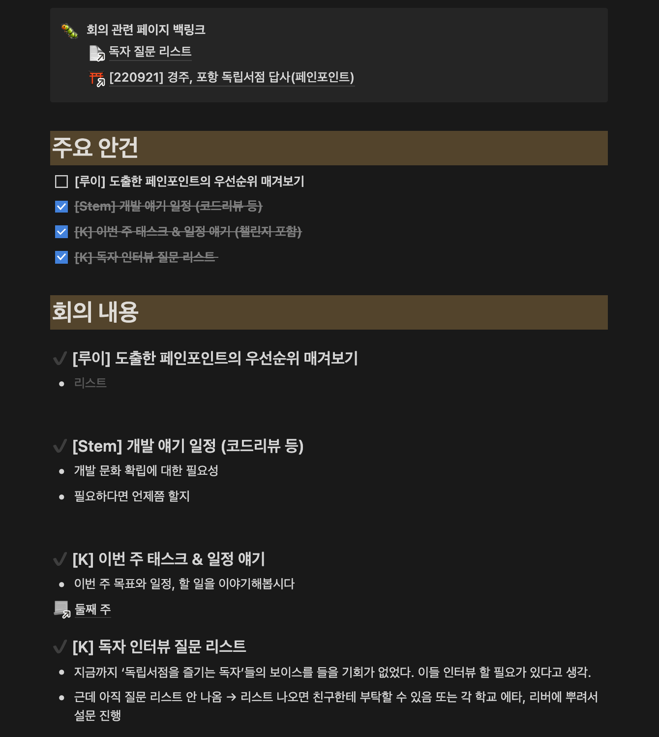 회의를 할 때는 노션 툴을 이용했다. 노션을 자주 이용해서 편하기도 하고, 방송국이나 멋쟁이 사자처럼에서부터 쭉 써온 회의록 템플릿을 노션에서 사용할 수 있다는 점 때문에 노션으로 회의를 진행했다. 특히 멋사에서 회의록의 효과를 톡톡히 봤는데, 회의록을 쓰고 부터는 같은 주제를 두 번 얘기하거나, 중요한 내용을 잊는 일과 같은 비효율적인 일이 거의 없었고, 회의 시간도 절반 정도 단축할 수 있어서 기록의 중요성과 효율성을 느꼈다. 그래서 이번에도 회의록 템플릿을 사용하였고, 자연스레 회의도 내가 진행하게 되었다. 특히 다음날 얘기할 사안을 미리 적어놓고 팀원들이 회의 참석 전에 이를 숙지하고 올 것을 부탁드렸는데, 이렇게 함으로써 1) 스스로 충분히 생각해볼 시간을 확보함으로써, 회의 시간을 줄일 수 있음 2) 그래서 양질의 아이디어를 미리 떠올릴 수 있음 이 두 가지 장점을 얻을 수 있었다.