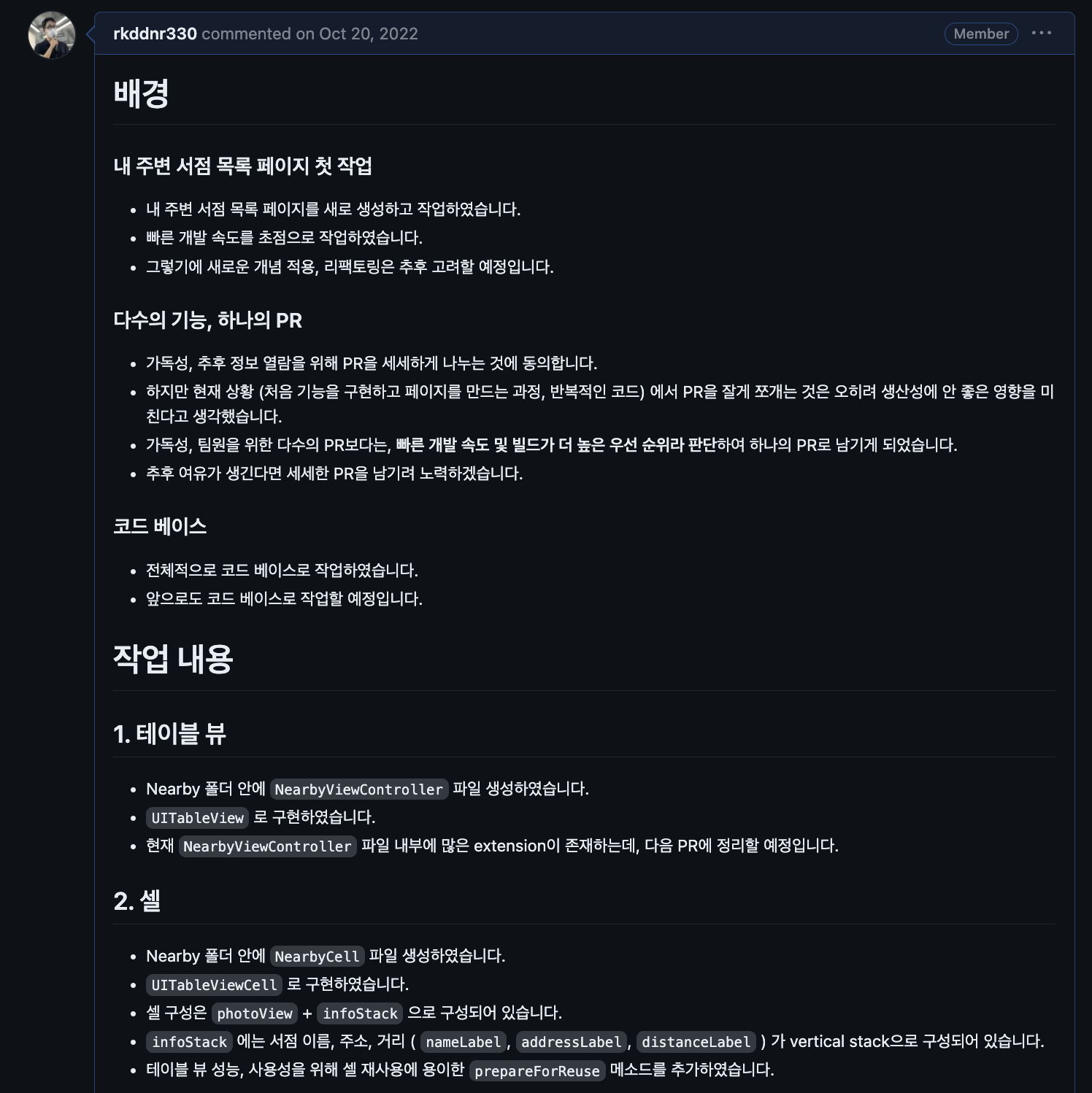 첫 PR을 날렸다. 얼마 전, Async Swift 컨퍼런스에 참여했는데, 29cm iOS 개발 리더 김우성 님의 '코드 리뷰 문화 세션'이 인상깊었다. 프로덕트 개발도 중요하지만, 성장도 필요한 우리 팀에게 적절한 문화라는 생각이 들었고, 팀원들에게 이 문화를 도입하자고 건의했다. 그에 따라서 첫 PR을 굉장히 세세하게 남기려고 했다. 그리고 코드보다 코드를 설명하는 말이 더 많아야 한다고 했고, 최대한 그렇게 하려고 했다. 이렇게 PR을 하는 게 처음이라 감이 안잡혀서 더 오래 걸렸다. 진짜 개발 팀에서 일하는 것처럼 하고 싶었고, 그래서 더욱 신경써서 남겼다. 이런 것을 체화하면서 회사에서 뽑고 싶은 신입이 되고 싶다. 진짜 잘하고 싶다.