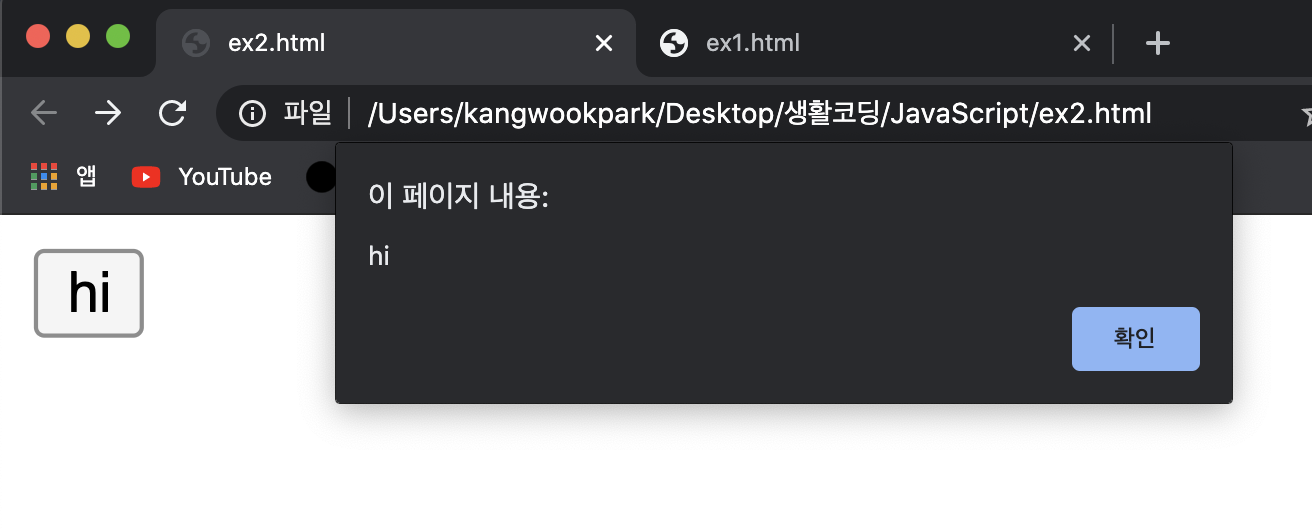 ①input 해석 : hi 문구가 적힌 버튼이 있고 클릭하면 hi라는 문구의 경고창이 뜬다.