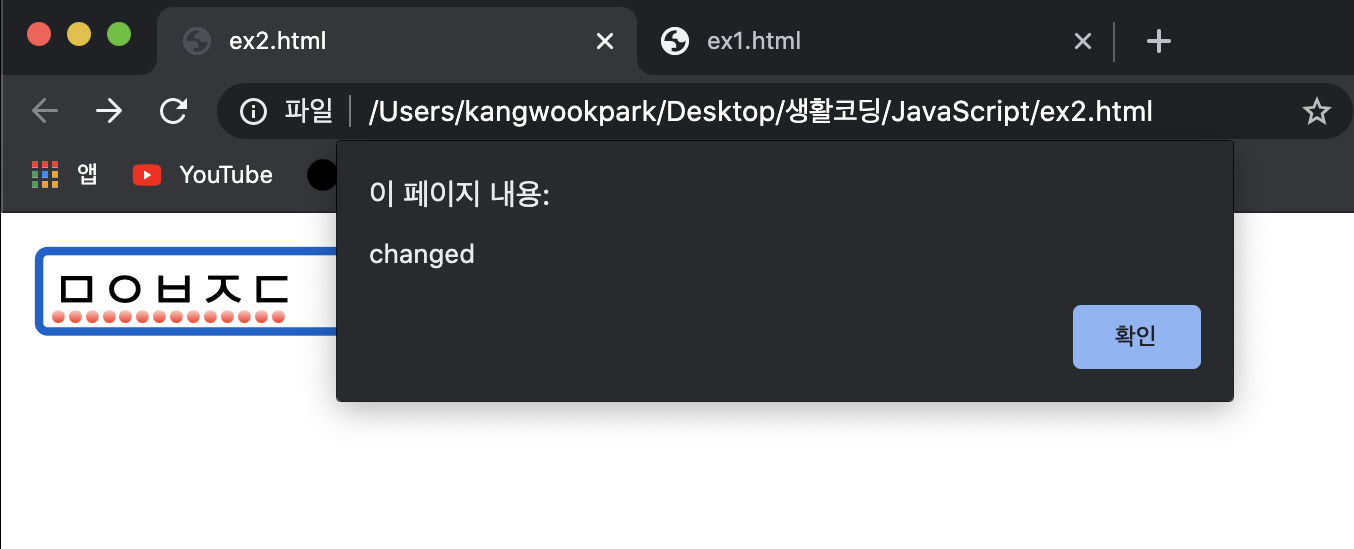 ②input 해석 : 텍스트를 입력하는 창이 있고 무언가 입력되어 값이 변하면 changed라는 문구의 경고창이 뜬다.