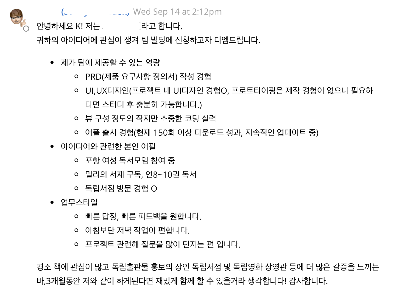 둘째 날이 되었다. 여전히 한 명의 팀원을 모으지 못한 나는 아카데미를 기웃거리며 팀원 할 사람 없나 찾고 있었다. 평소 같이 일해보고 싶다는 생각이 들었던 몇몇에게 합류 의사를 물어봤지만, 역시나 이미 팀을 다 결성한 상황이었다. 그러던 중 아카데미 첫 프로젝트를 같이 했던 개발자와 디자이너 두 분이 팀원 모집이 잘 되어가냐고 물어왔다. 디자이너 분은 알고 보니 이미 포항에 있는 독립서점 몇 군데를 둘러보기도 하고, 서점에서 진행하는 북토크에도 참여할 정도로 독립서점 문화를 깊이 이해하고 즐기시던 분이었다. 개발자 분도 내 아이디어에 충분히 관심을 가지고 계셨고, 다른 팀을 둘러보고나서 내 팀 쪽으로 마음이 기울었다고 해주셨다. 이미 팀으로 같이 합을 맞춰본 사이이기도 하고, 좋은 인상을 받았기 때문에 곧바로 팀 합류를 확정지었다.