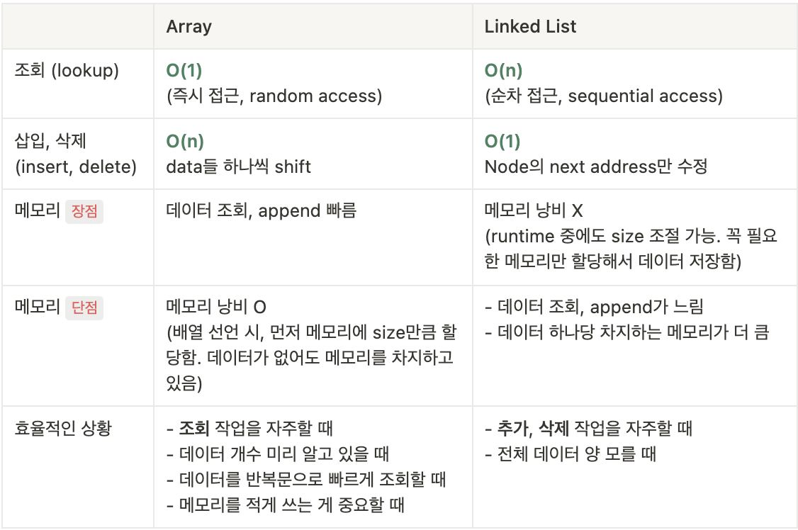 - → 하지만, 각 Node당 data와 next address를 들고 있기 때문에 data 하나당 차지하는 메모리가 더 큼