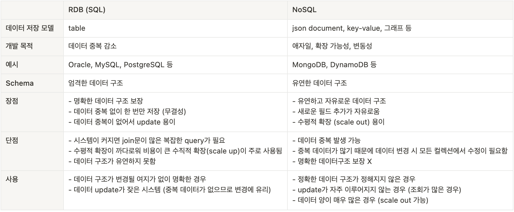 RDB는 정형화된 틀을 통해 데이터를 저장하는 시스템이다. 철저히 구분된 틀이 있기 때문에 중복되는 값이 적다. 따라서 정보의 업데이트가 잦은 구조에 유리하다. 하지만, 너무 엄격한 틀이기 때문에 유연성이 적고, 확장성이 떨어진다. 단순히 수직적으로밖에 확장을 못한다. 따라서 변동성이 적은 정보에 유리하다. 많은 데이터를 처리하기 보단, 적은 데이터를 처리하는 데 유리하다.