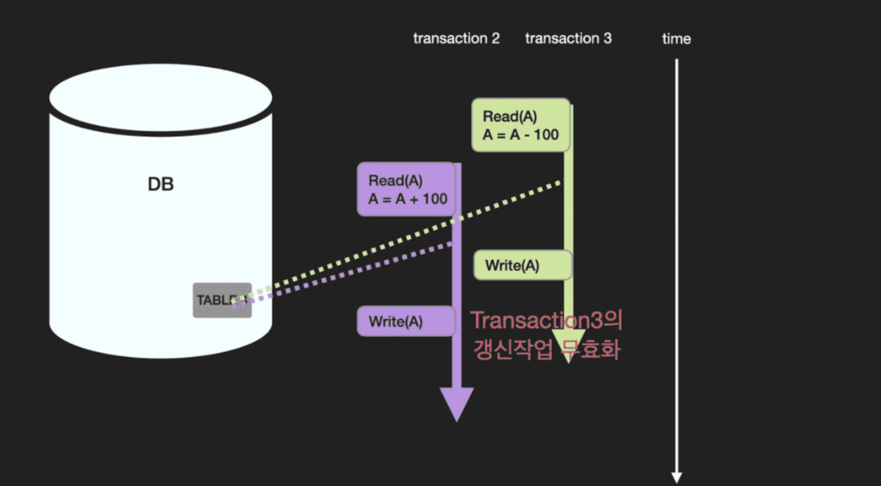 위 사진에서 보듯, transaction3의 작업이 Write 되기 전에 transaction2가 데이터를 들고가서 업데이트하고 Write해버린다. 이렇게 되면, 3의 작업은 적용되지 않기 때문에 갱신손실 문제가 발생한다. 이 상황에서 동시성 제어가 필요하다.