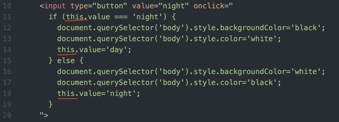 이 코드에서 빨간 밑줄은 전부 중복되는 값이고, 무엇보다도 자기 자신을 가리키는 값들이다. 이 값에 id 값을 부여하면 물론 좋지만, 결국 개수가 늘어남에 따라 우리는 id값 하나 하나에 고유한 값을 부여해주어야 한다. 이럴 때는 'this'라는 코드를 쓰면 된다.
