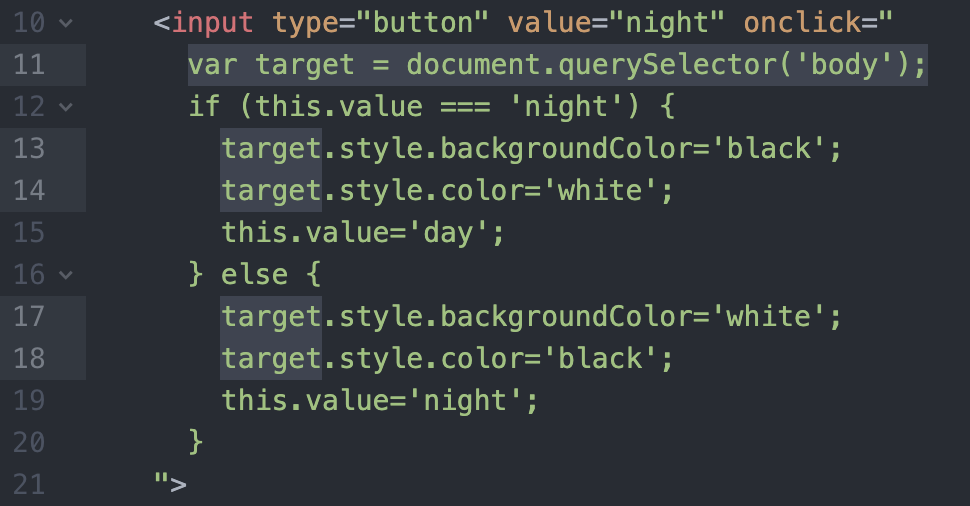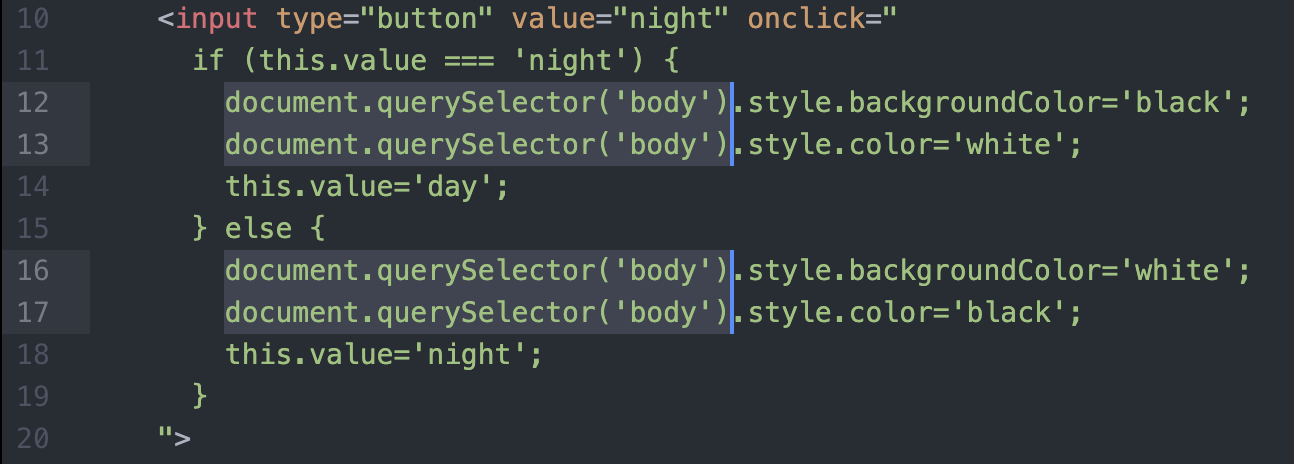 여기서 document.querySelector('body') 코드가 4번이나 중복된다. 이를 없애기 위해 '대입 연산자'를 통해 효율성을 올려보자.