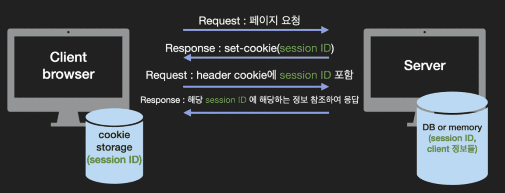 - 서버는 클라이언트 정보를 DB 또는 메모리에 저장하고, 클라이언트의 session ID를 발급한다.