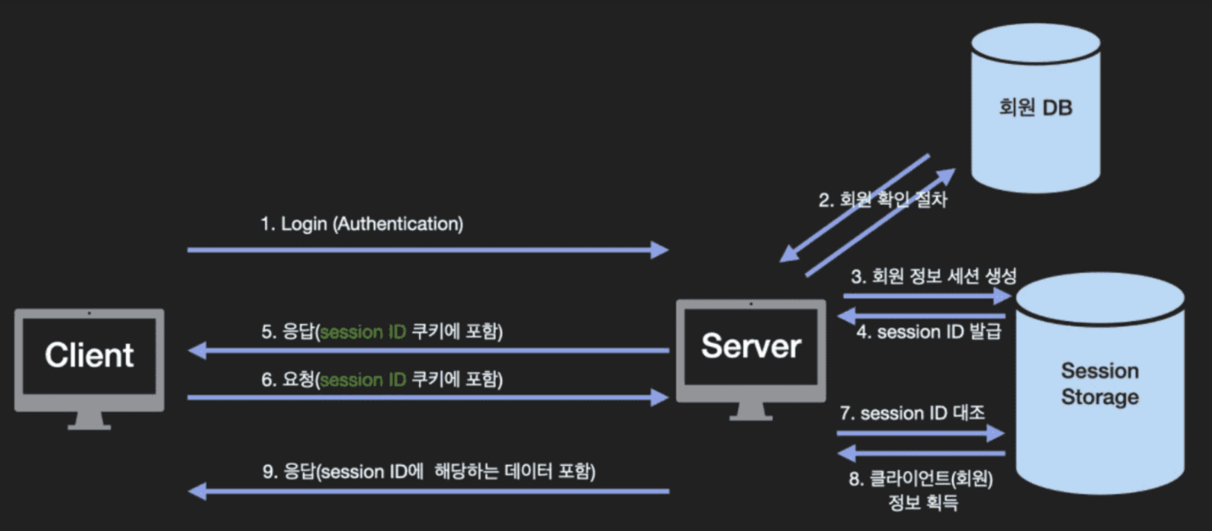 - 서버는 클라이언트가 보낸 session ID를 세션 저장소에서 확인한다.