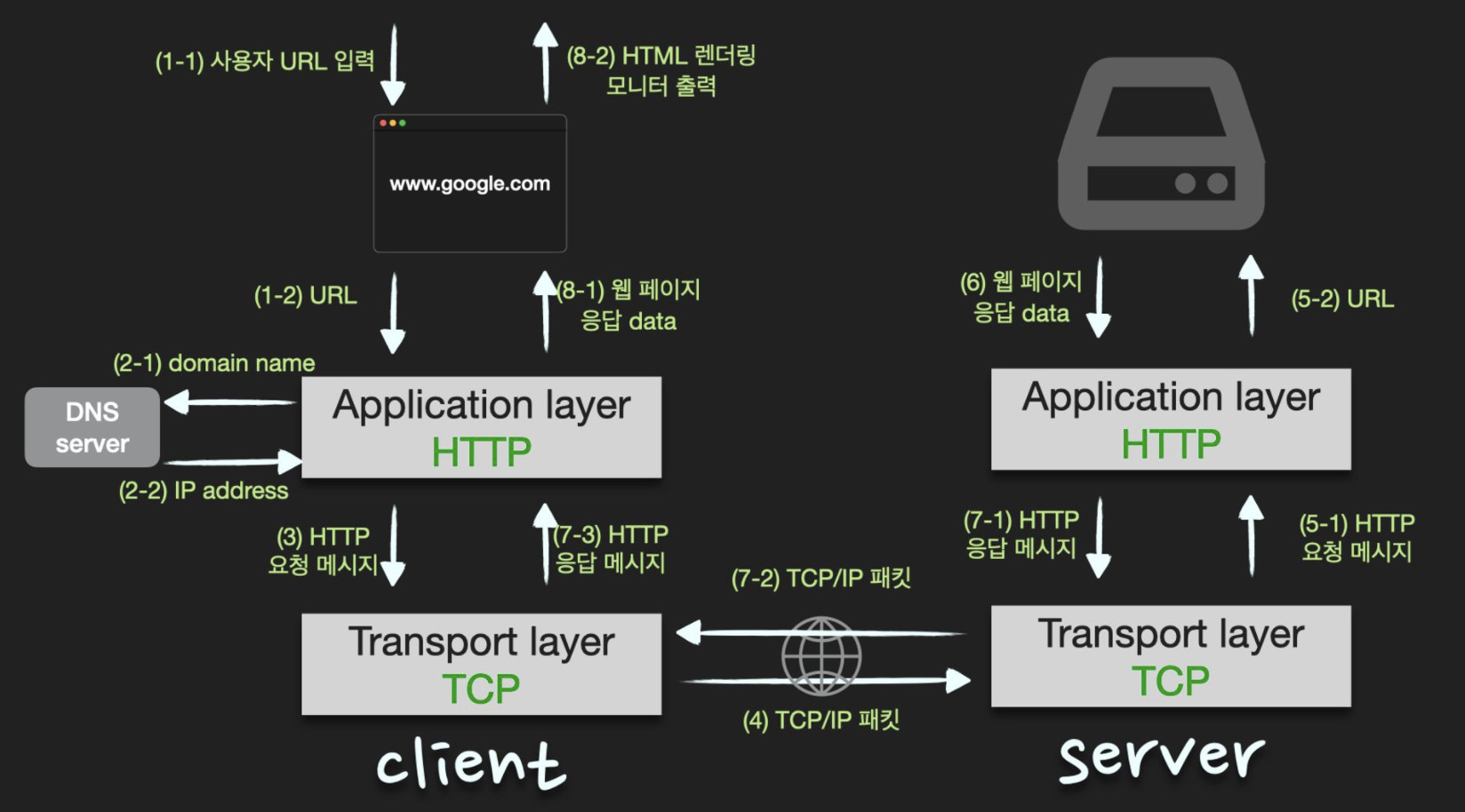 인터넷 브라우저에 “www.google.com”을 검색하면 어떤 과정으로 진행되는지 네트워크 관점에서 알아보자.