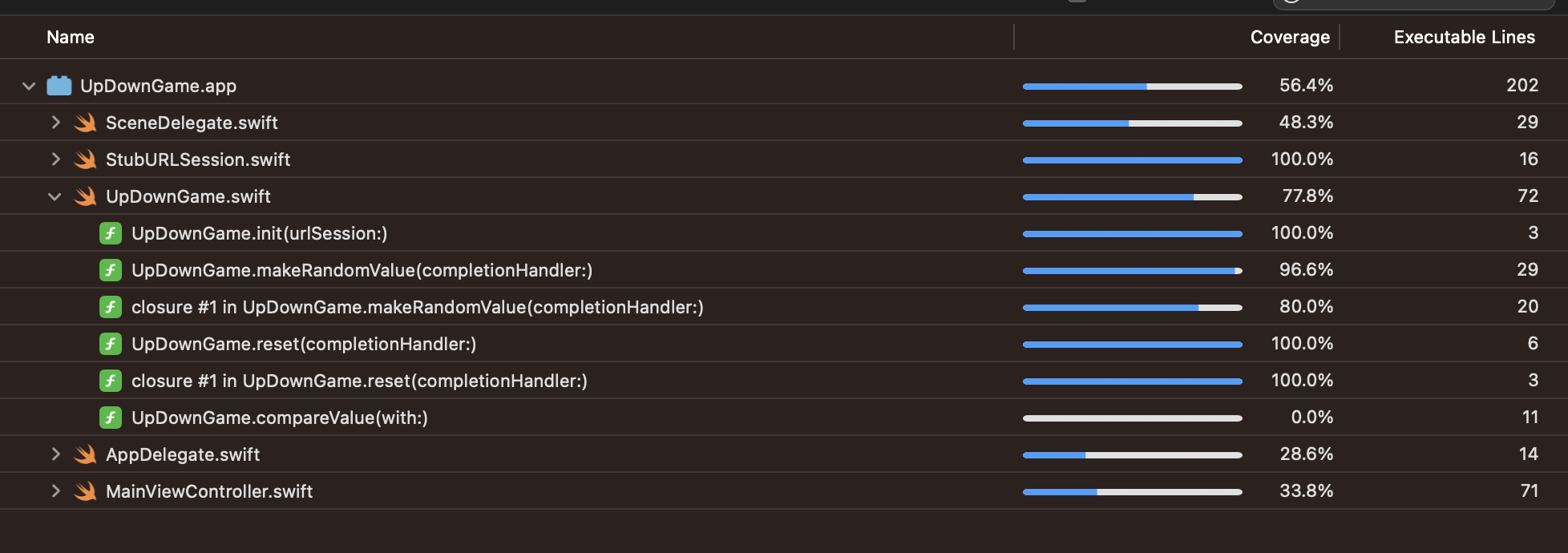 그런 다음 다시 테스트 코드를 실행하면 (Cmd + U) Coverage 수치를 확인할 수 있습니다.