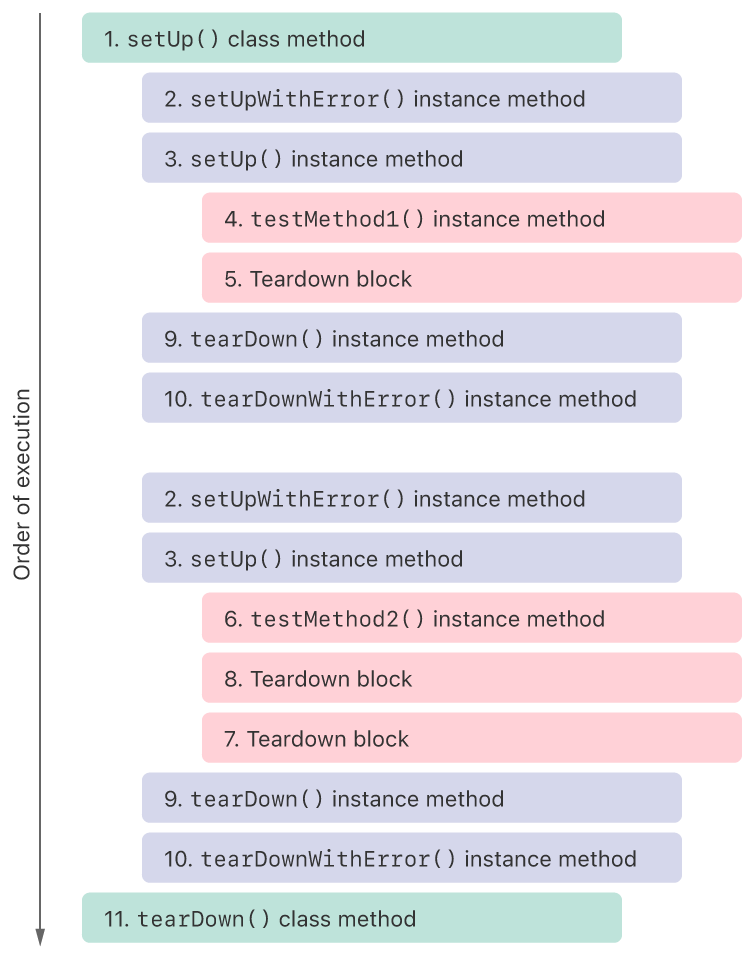 XCTest에서 setUp()은 테스트 메소드가 실행되기 전 호출되는 메소드이고, tearDown()은 모든 테스트 메소드(이름이 "test"로 시작하는 메소드)의 실행이 완료된 후에 호출되는 메소드입니다.