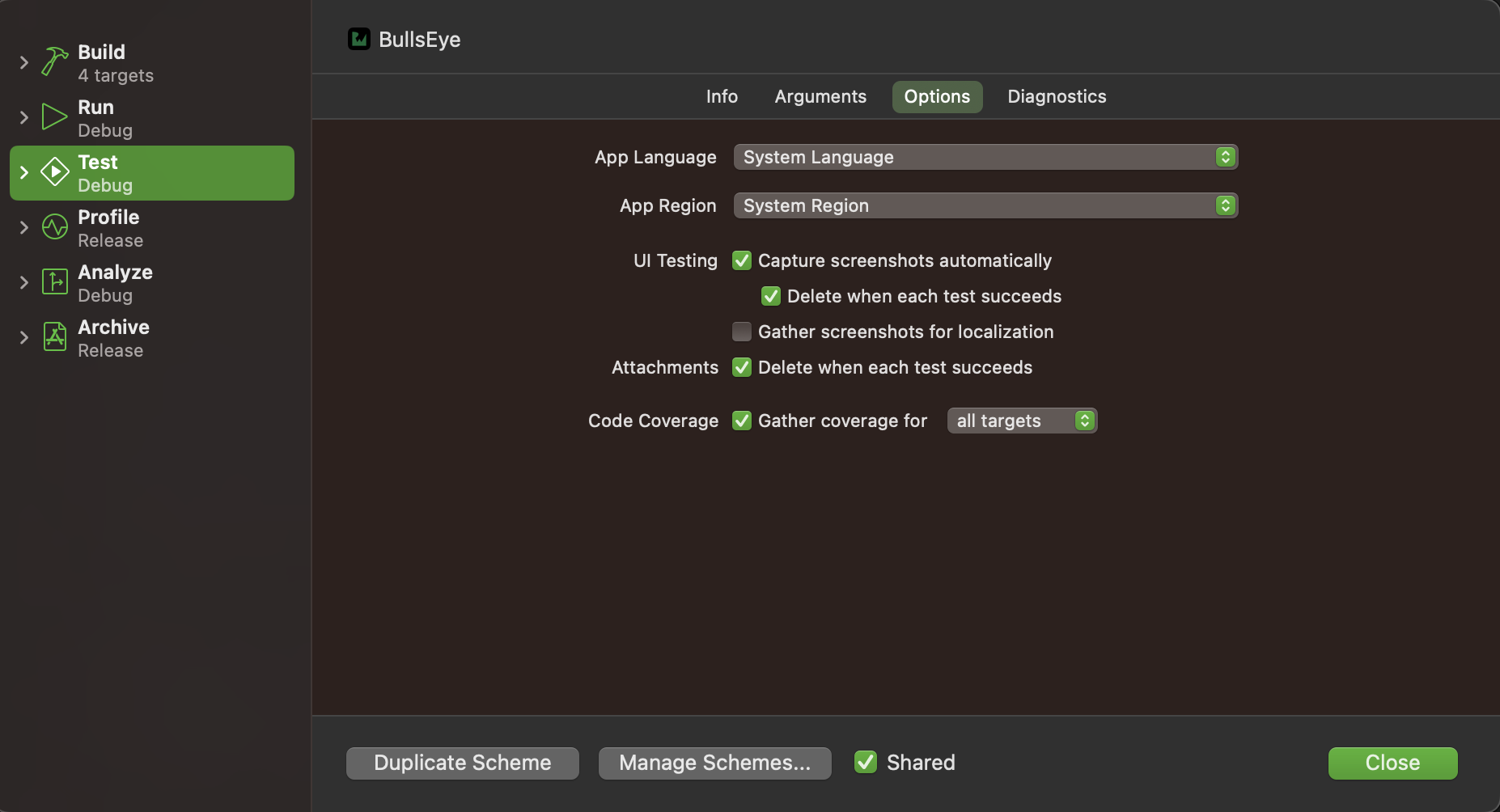 XCode에서 Product > Scheme > Edit Scheme의 메뉴로 가면 이 화면이 나옵니다. 여기서 Test 메뉴에서 Code Coverage for 항목을 체크하고 Close를 해줍니다.