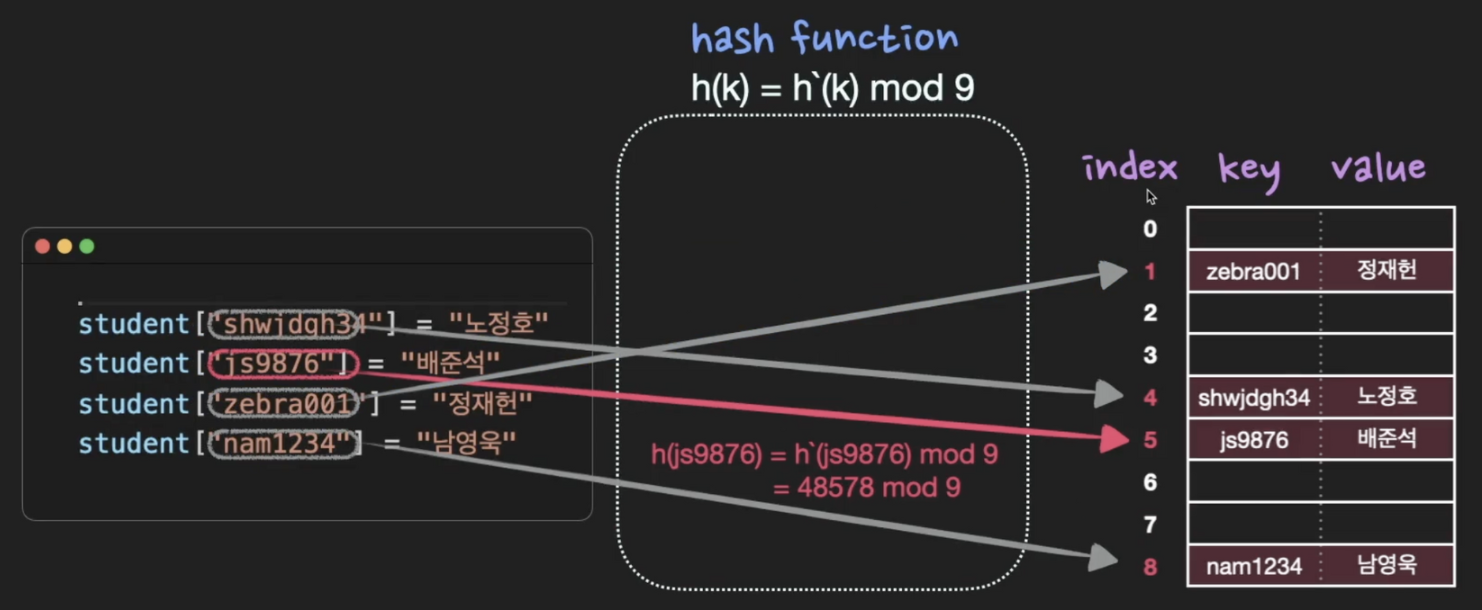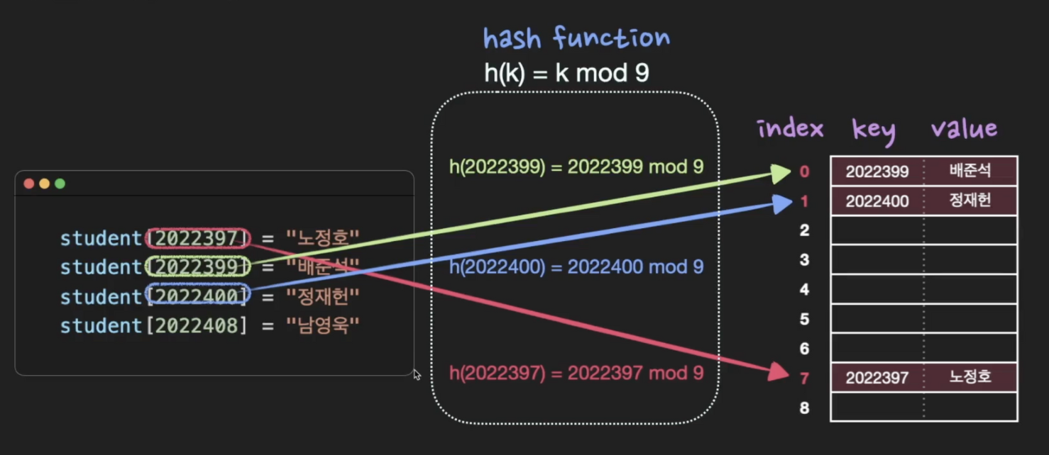 - (key, value) 데이터 쌍을 저장할 때 해시 함수 $h$ 를 이용해서 $h(k)$를 인덱스로 저장하는 자료구조