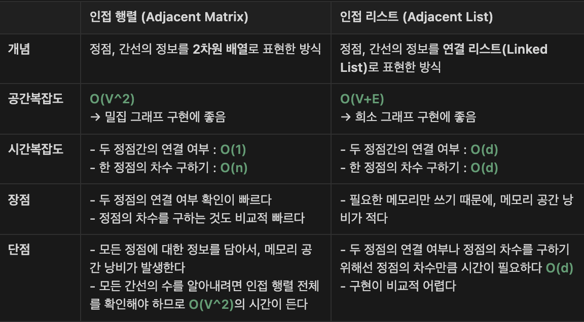 - 방향 그래프에선 차수(degree)가 두 가지 종류(indegree & outdegree) 로 나뉨