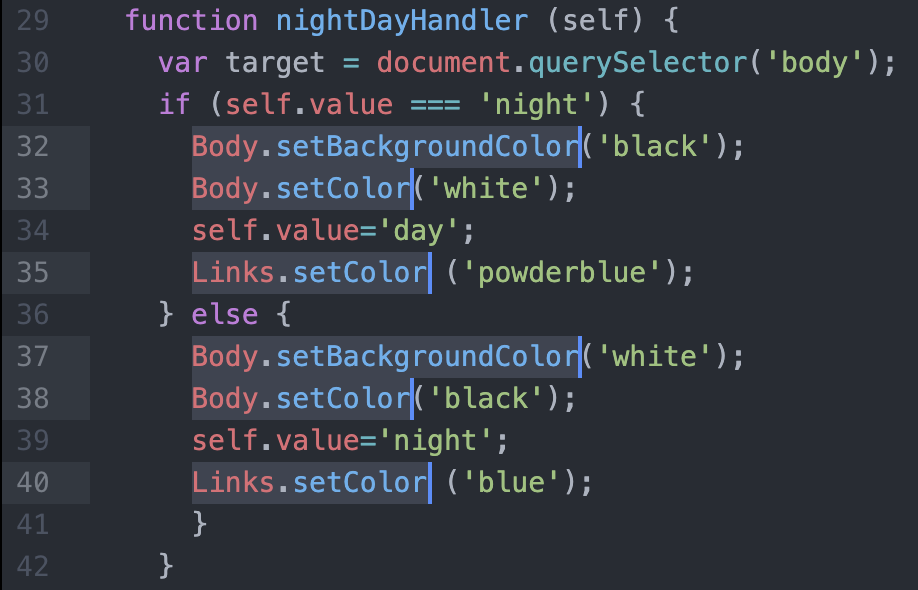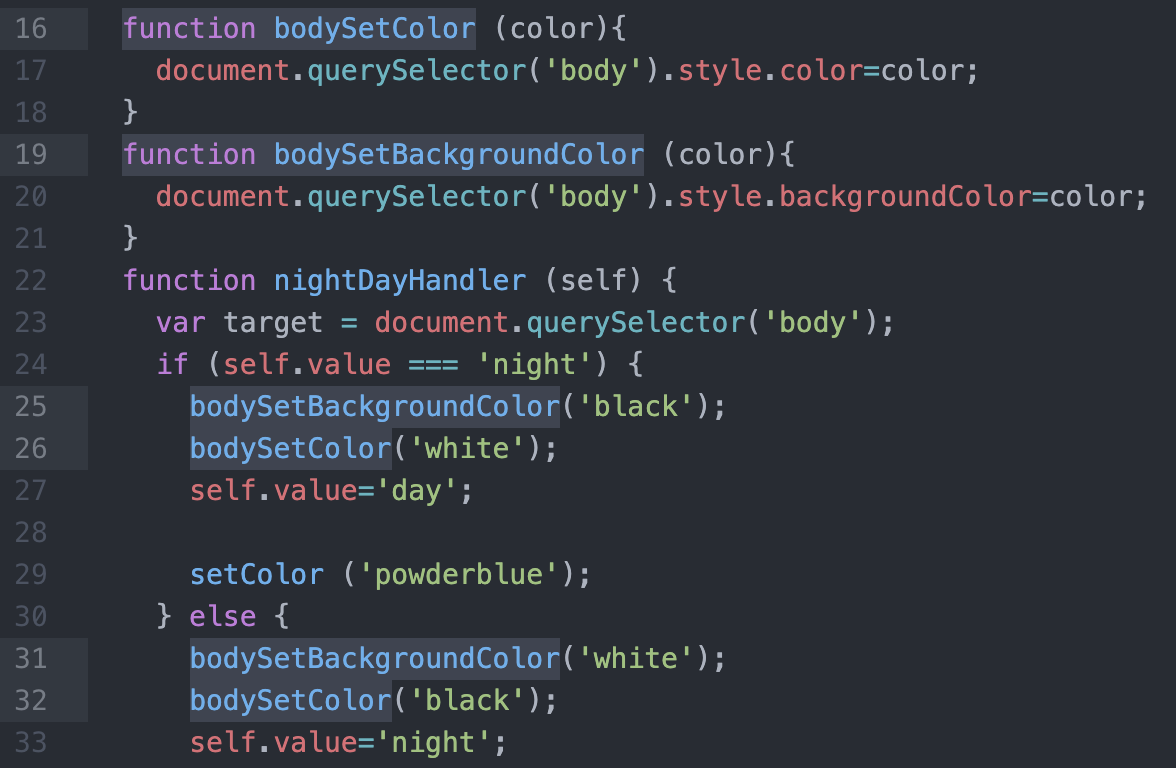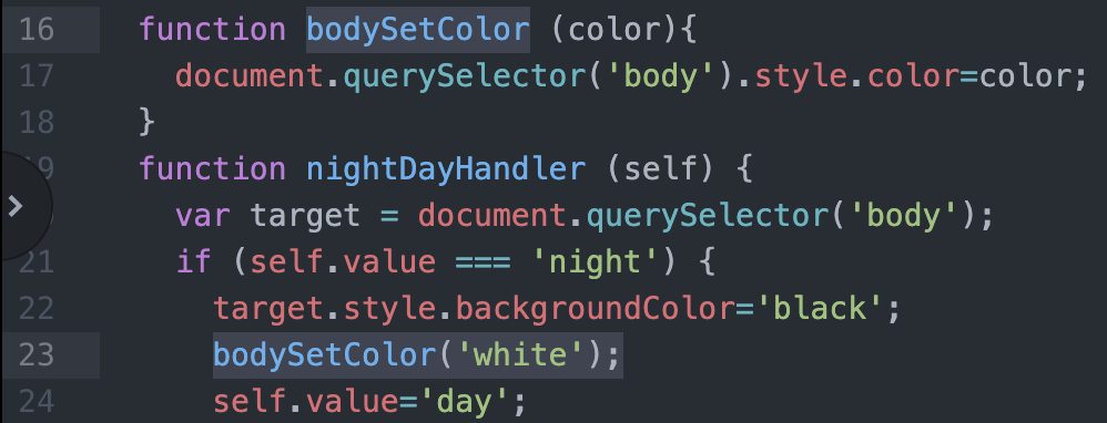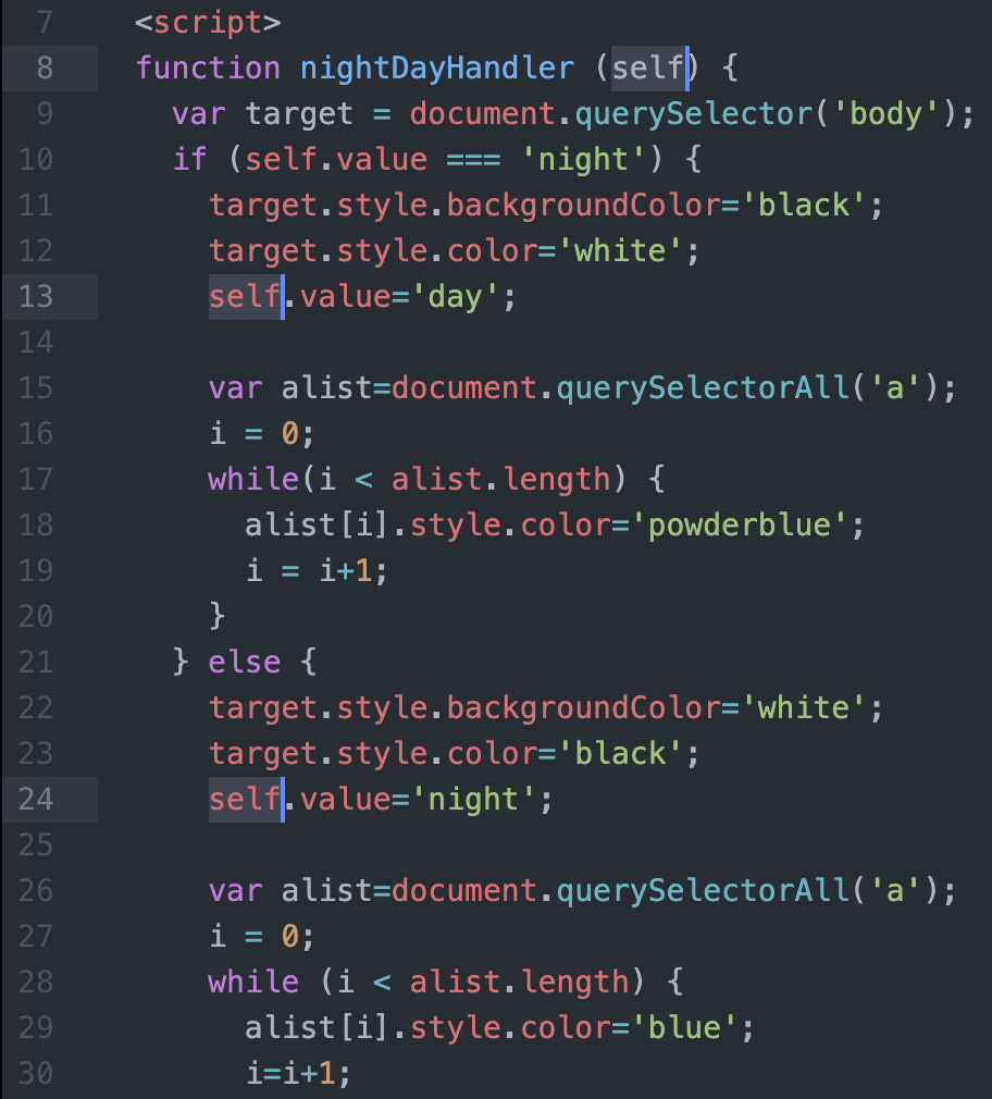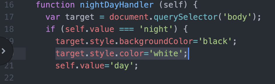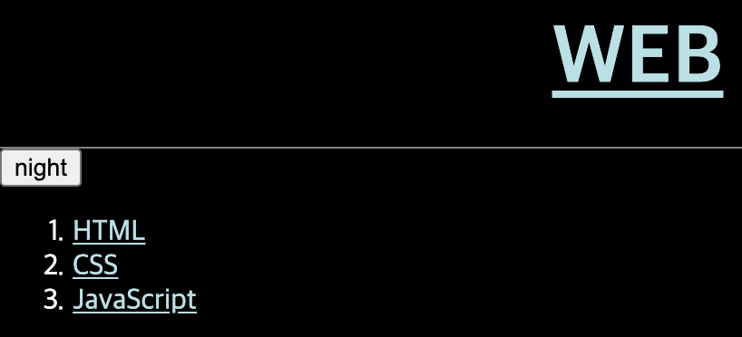 우리가 만들어온 웹 페이지로 돌아와서, night day 버튼을 함수를 이용해서 만들어보자.