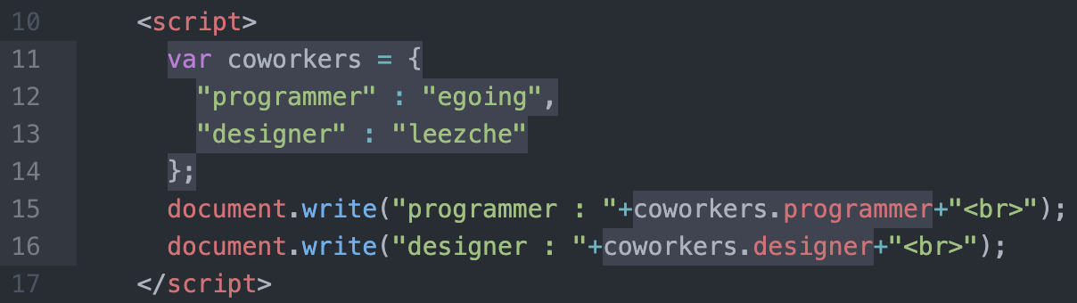 객체를 설정할 때는 객체의 이름과 중괄호{ } 를 이용한다.