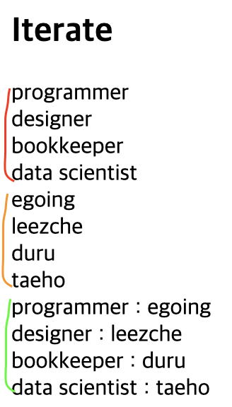 - Iterate (객체에서 반복해서 꺼내기)