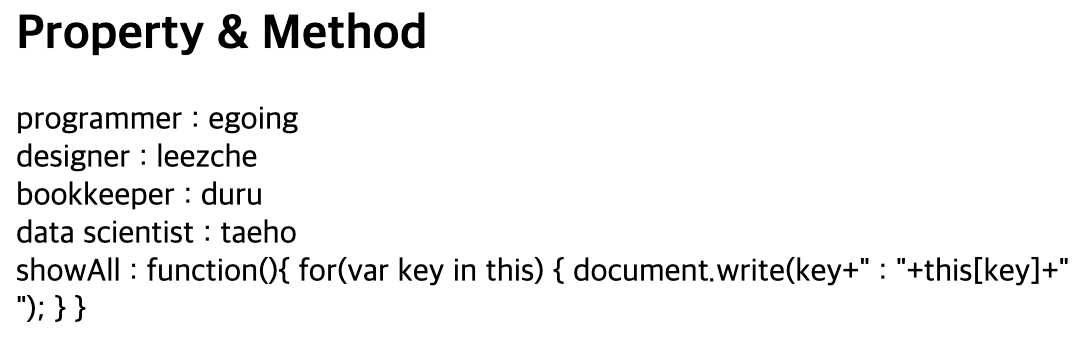- Property (key값, value ..) & Method (함수)