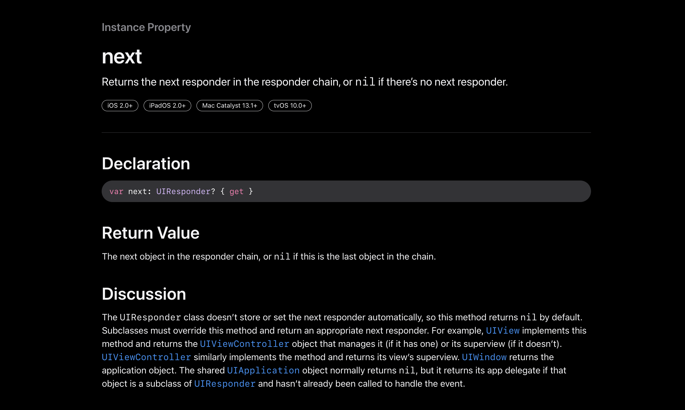 next 프로퍼티는 이벤트 응답 체인에서 현재 UIResponder 객체 다음에 오는 객체를 반환한다. 다음 UIResponder 객체는 뷰 계층 구조에서 이벤트를 처리할 수 있는 다음 객체이며, 만약 다음 객체가 UIResponder 객체가 아니면 nil을 반환한다.