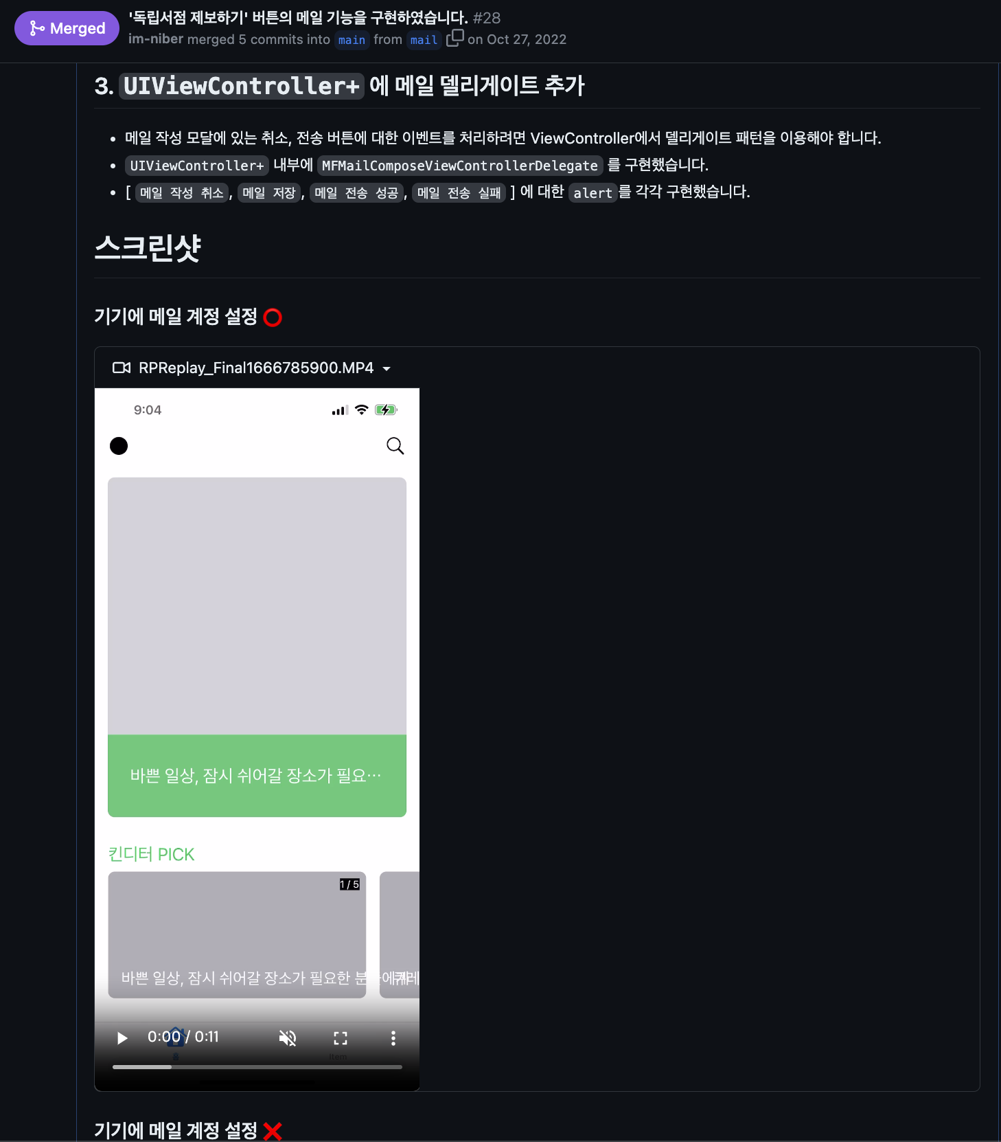 나는 평소 하던대로 구글에 메일 기능을 구현하는 방법을 검색하고, 블로그 글과 스택 오버플로우를 바탕으로 찾아갔음. 메일 기능을 구현하려면 MessageUI 프레임워크를 사용하면서 되었고, 블로그에 있는 코드들이 그리 복잡한 코드가 아니었기 때문에 쉽게 해결할 수 있을 것이라고 예상했다.