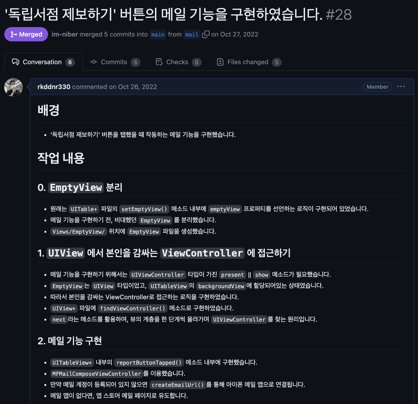 이거면 UIView에서 UIViewController 클래스에 접근할 수 있을 것 같았고, 코드로 UIViewController를 찾는 메소드를 만들어서 해봤더니 드디어 됐다. UIViewController 타입에 접근할 때까지 재귀적으로 수행하는 메서드를 만들었고, 이를 활용하여 현재 UIView를 관리하는 UIViewController를 반환하는 코드를 만들어 메일 기능을 성공적으로 구현할 수 있었다. 더 나아가, 이런 시행착오를 팀원들과 공유하며 같은 기능이 필요한 팀원이 있었다는 것을 알게 되었고, 쉽게 이용하도록 extension으로 할당하여 어디서든 쓸 수 있게 공유하였다.