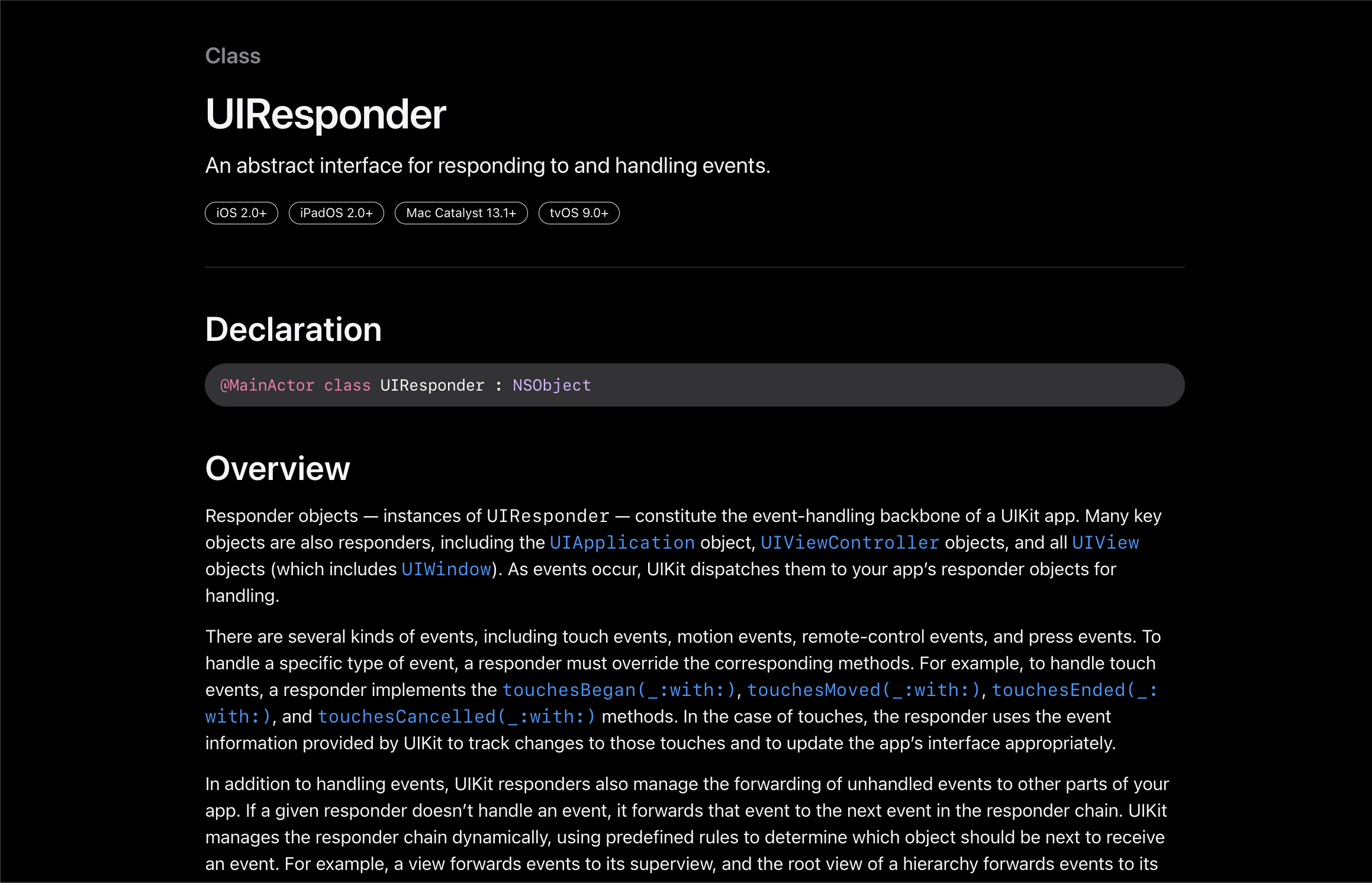 UIResponder 클래스는 iOS 앱에서 이벤트 응답 처리를 위한 기본 클래스이며, 모든 이벤트 응답 체인의 시작점이었고, UIViewController와 UIView 모두 UIResponder의 서브 클래스였다.