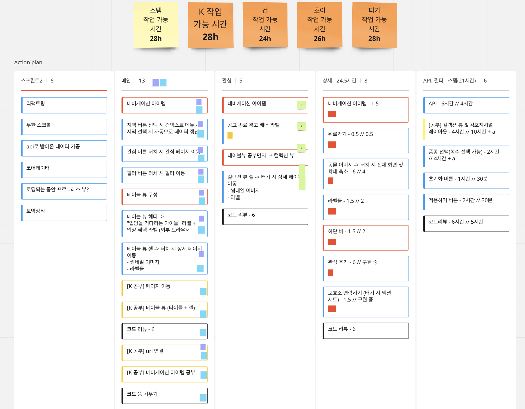 플래닝 포커를 통해 태스크에 대한 시간을 산정했고, 예상 시간을 도출하는 식으로 스프린트를 계획했다. 나는 플래닝 포커를 통해 태스크를 산정할 때 공부 시간 또한 많이 투자했다. 아무래도 처음이기 때문에 인터넷 강의를 통해 공부하고 익숙해진 다음에 기능을 구현하는 식으로 작업을 해야했기 때문이다. 이전에 태스크를 산정할 때는 공부 시간을 각자 암묵적으로 포함하는 것에 그치는 경우가 많았는데, 플래닝 포커를 통해 공부 시간을 따로 할애하고 전체 작업 시간을 정확하게 계산할 수 있어서 일정 조율이 용이했다.