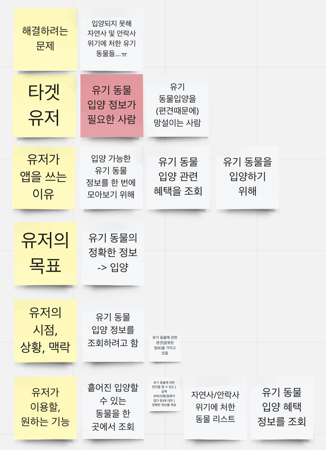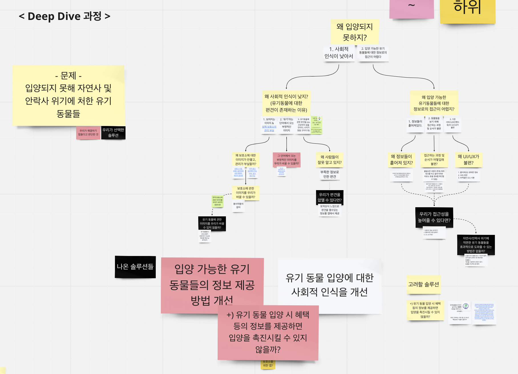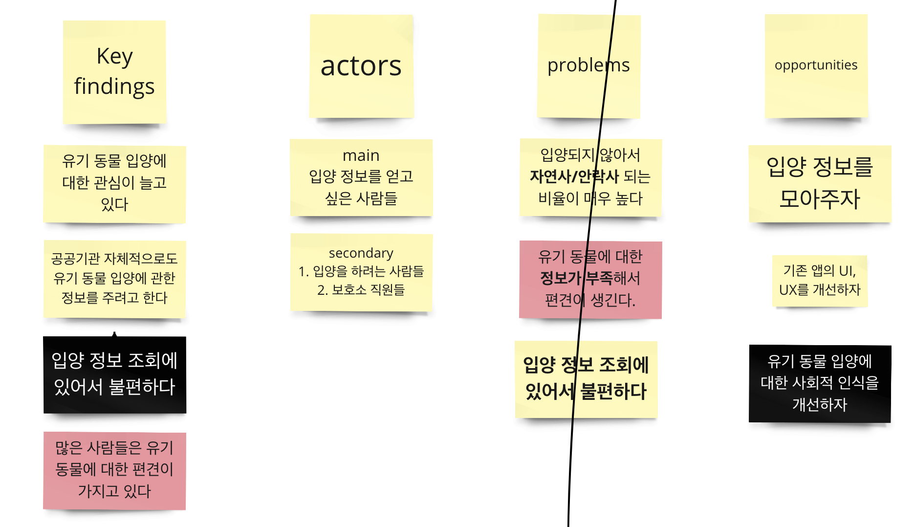 그중 우리는 '유기 동물' 커뮤니티로 정했다. 반려 동물을 키우고 있는 팀원이 하나도 없었다는 건 아이러니하지만, 모든 팀원이 어느 정도의 관심을 보이기도 했고, 우리가 타겟팅하기에 규모적으로나, 정보를 접할 경로의 관점으로나 괜찮은 커뮤니티라고 생각했다. 우리는 우선 뉴스 기사나 인터넷 커뮤니티를 중점적으로 정보를 모아갔다. 또한 반려 동물을 키우는 사람이나, 유기 동물에 관심이 많은 사람을 대상으로 리서치도 진행하였다. 우리는 이 과정에서 유기 동물의 안락사 문제, 임시 보호 문제, 유기 동물 입양이 번거롭다는 문제를 발견하게 되었다.