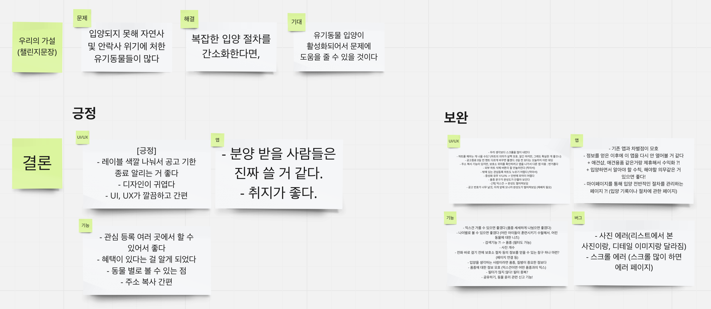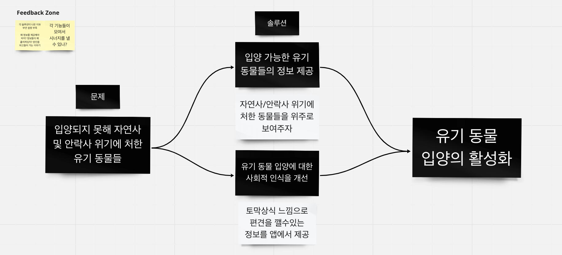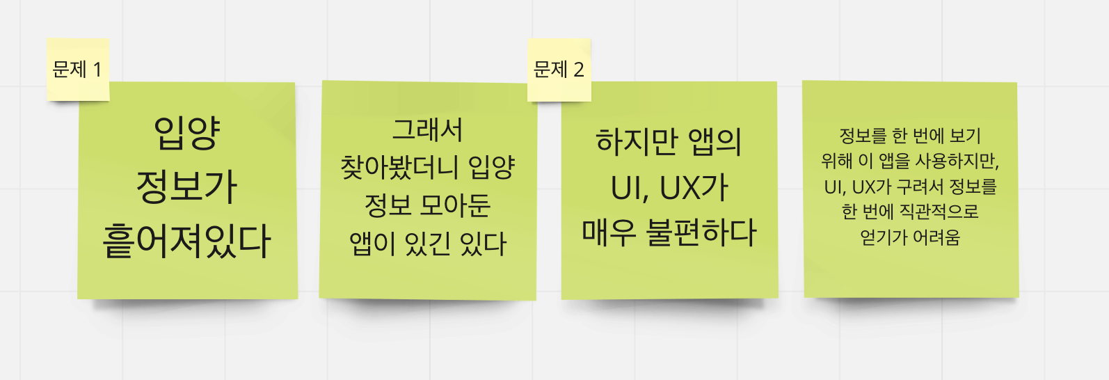 그중 우리는 '유기 동물' 커뮤니티로 정했다. 반려 동물을 키우고 있는 팀원이 하나도 없었다는 건 아이러니하지만, 모든 팀원이 어느 정도의 관심을 보이기도 했고, 우리가 타겟팅하기에 규모적으로나, 정보를 접할 경로의 관점으로나 괜찮은 커뮤니티라고 생각했다. 우리는 우선 뉴스 기사나 인터넷 커뮤니티를 중점적으로 정보를 모아갔다. 또한 반려 동물을 키우는 사람이나, 유기 동물에 관심이 많은 사람을 대상으로 리서치도 진행하였다. 우리는 이 과정에서 유기 동물의 안락사 문제, 임시 보호 문제, 유기 동물 입양이 번거롭다는 문제를 발견하게 되었다.