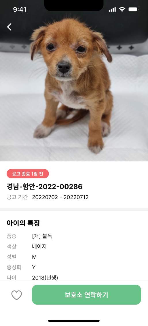 우리 앱의 가장 큰 특징이자 차별점 중 하나인, 공고 마감 기한 레이블이다. 우리 앱의 취지는 안락사되는 유기동물을 한 마리라도 줄이는 것이기 때문에, 안락사가 얼마 남지 않은 동물부터 목록의 최상단에 배치시켰다. 셀 우측 최상단에도 공고 마감 기한을 표기하였고, 좀 더 직관적인 인식을 위해 신호등의 색을 도입했다. (3일 이내의 동물은 빨간색, 이후는 주황색, 비교적 널널한 기한은 초록색으로 표기하였다.) 메인 색은 눈과 마음이 편할 수 있는 포근한 초록색 (개발자라 이렇게 설명하는 게 최선이다.)을 선정했는데, 그 이유는 동물이 좋은 주인 품으로 돌아가서 자연으로 뛰어놀았으면 좋겠다는 취지였다. 잘 어울리는 것 같다.