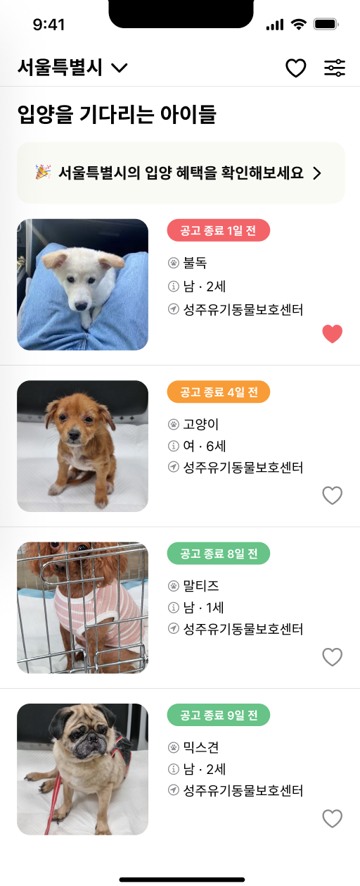 우리의 앱이 말하고자 하는 것은 간단 명료했기 때문에 이 부분을 유저에게 말하고 행동을 유도하고 싶었다. 유기동물의 안락사를 막기 위해 유기동물 공고만을 배치했고, 테이블 셀을 터치해서 들어가면 곧바로 유기동물을 보호하고 있는 센터에 연락할 수 있도록 유도했다. 또한, 동물들이 굉장히 많기 때문에, 마음에 든 동물은 어떤 화면에서든지 좋아요 버튼을 누를 수 있도록 표시했고, 이를 모아서 보는 페이지도 구현했다. 좋아요 목록에서도 마찬가지로, 동물의 공고 기한 레이블을 사진과 같이 표기하여, 마감까지 며칠이 남았는지 알려주도록 했다.