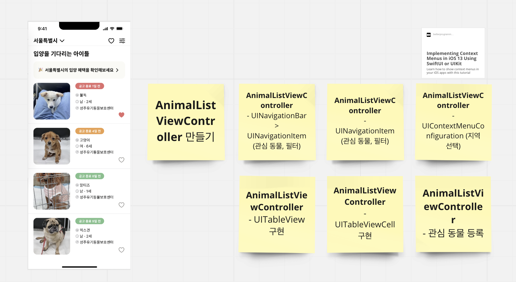 자료 조사를 통해 얻은 페인 포인트를 조금 더 파고들었고, 입양되지 못해 자연사 및 안락사 위기에 처한 유기 동물을 돕자는 것을 메인 주제로 삼았다. 주제가 정해진 근거로는 모든 팀원이 공감한다는 점 뿐만 아니라, 기존의 문제점 중 우리가 개선할 부분이 많다는 점도 있었다. 일단은 유기 동물에 관한 앱이 몇 개 존재했다. 하지만 iOS 개발을 공부하는 입장에서 봤을 때 여러 문제가 있었다.