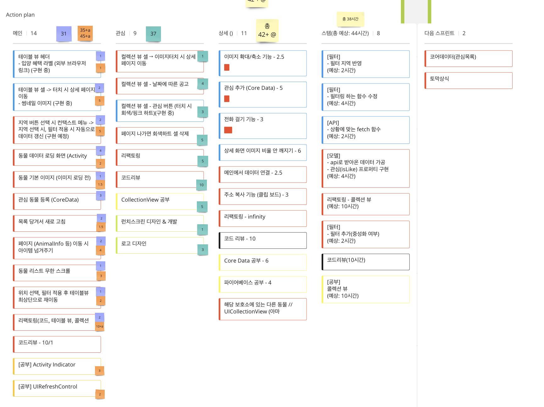 나는 메인 UI 개발을 담당했다. 또한, UIKit이 처음이었기 때문에, 이미 UIKit 경험이 풍부한 팀원과 함께 기능을 개발하게 되었다. 본격적으로 개발에 들어가기 전에, 구체적으로 어떤 부분을 개발해야 하는지 분석했다. 메인 뷰에 들어갈 컴포넌트나 클래스 같은 것들을 정리했고, 이를 토대로 플래닝 포커에 적용했다.