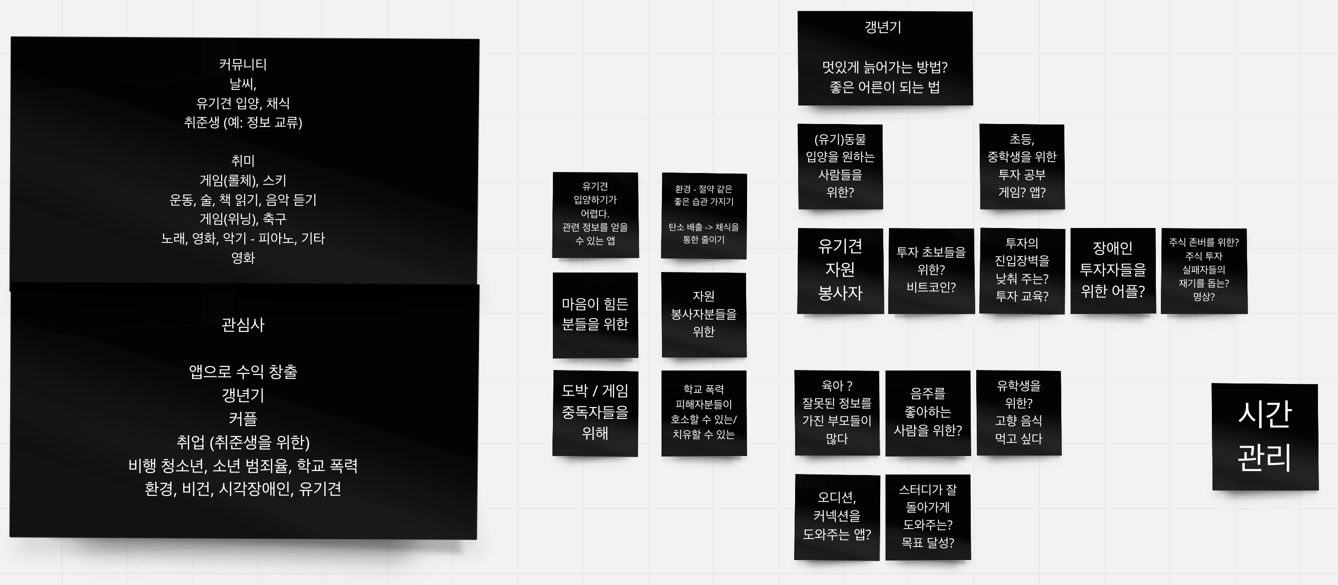 이번 프로젝트의 주제는 '커뮤니티에 임팩트를 주는 것'이었다. 평소 사회에 선한 영향력을 끼치고 싶다는 말을 입에 달고 살았는데, 이와 비슷한 주제라 좋은 결과물을 만들어내고 싶었다. 우선은 각자 관심 있는 분야나 커뮤니티에 대한 얘기를 나눴고, 이 중에서 공통으로 관심이 생기는 분야 몇 개를 필터링했다.