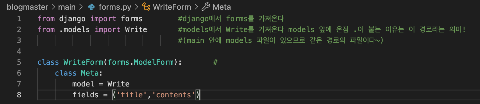 forms.py 로 가서 글 작성 form을 설정해준다.