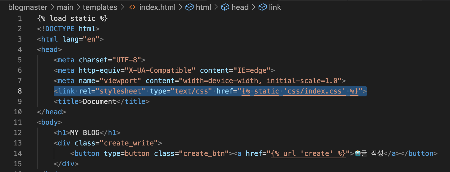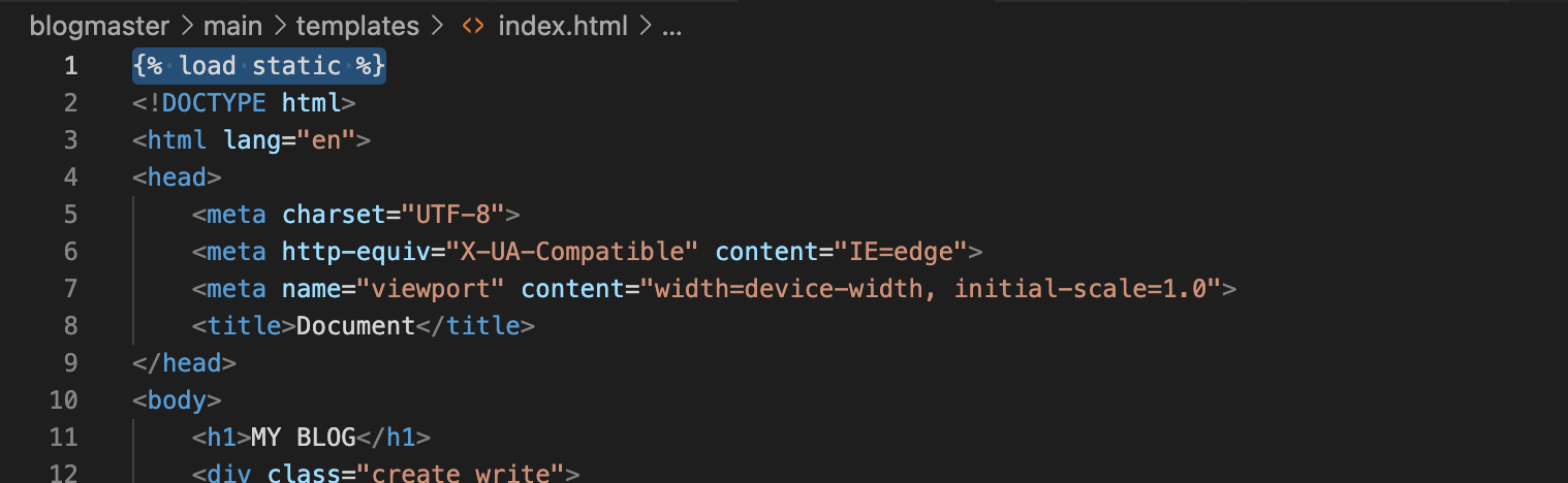 꼭 index.html 파일 맨 첫 줄에 {% load static %}라고 써야 한다 !!!