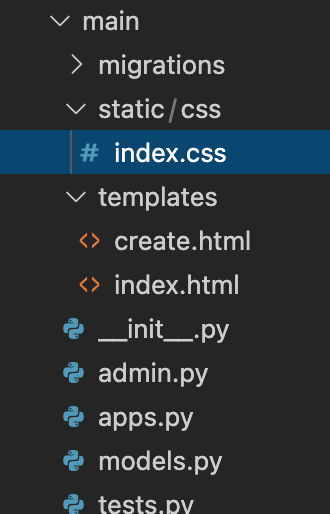 ① 생성한 app 안에 static 폴더 생성 후 static 폴더 안에 css 폴더 생성하고 index.css 파일 생성