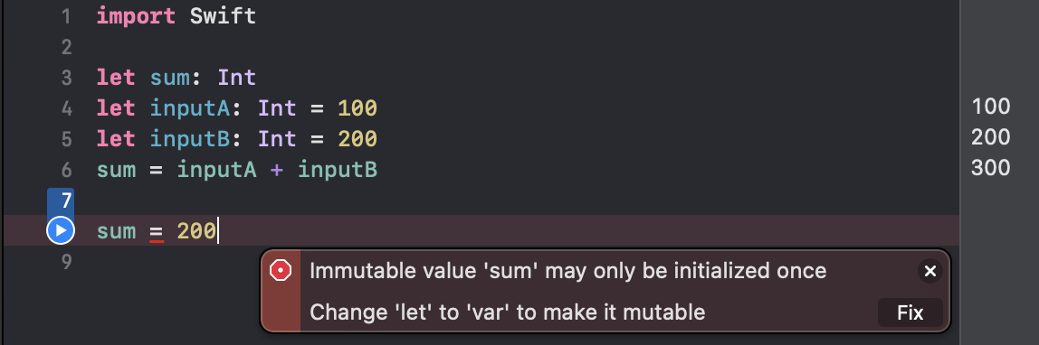 let을 통해 sum이라는 상수명(sum)과 타입(Int)을 먼저 선언해주었다. (-3번째 줄)