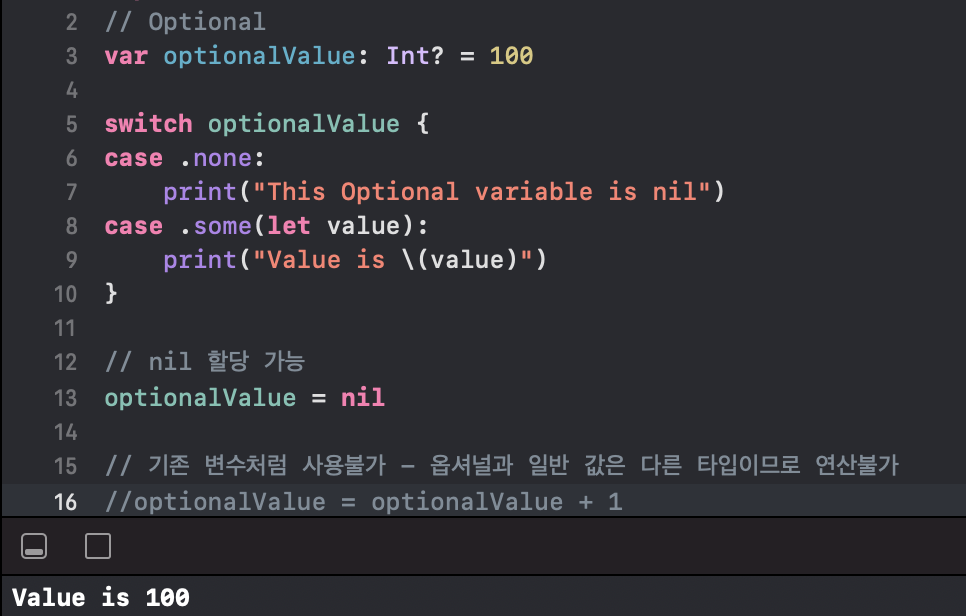 옵셔널 문법 = enum + generics (나중에 다시 자세히 배운다고 함)