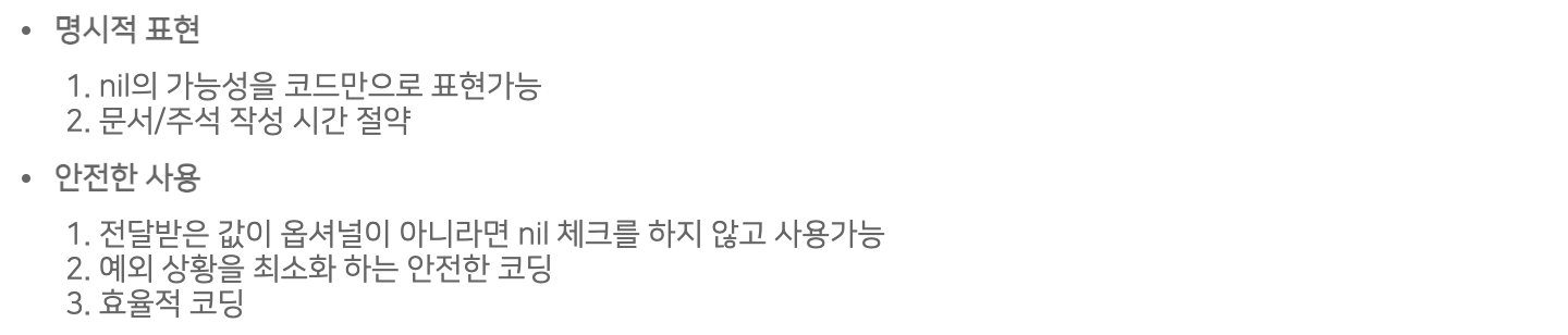 값이 있을 수도, 없을 수도 있음을 표현하는 개념 => nil이 할당 될 수 있냐 없냐