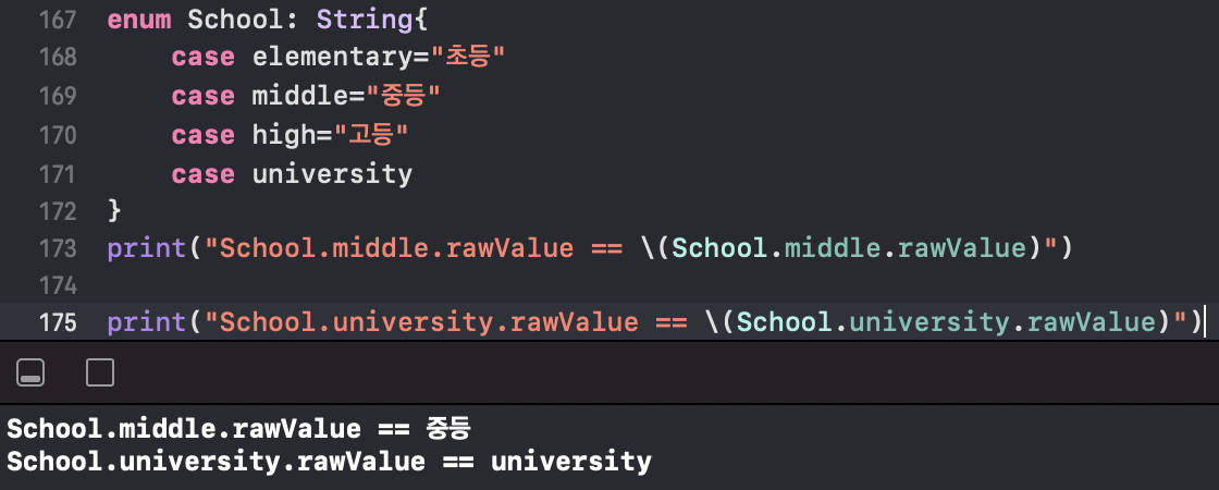 case university의 원시값을 우리가 지정해주지 않았다. 정수값도 아니기에 자동으로 1씩 증가하지도 않는다. 이 상황에서 university의 rawValue값을 부르면 어떤 결과가 나올까?