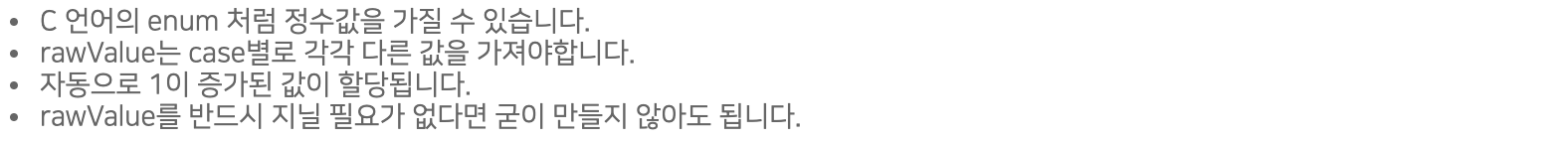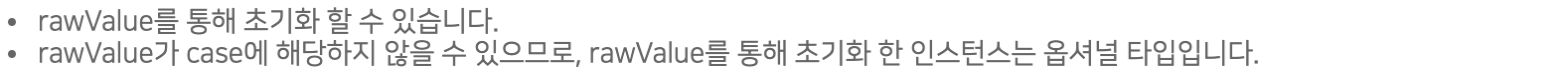 정수 타입 뿐만 아니라, Hashable 프로토콜을 따르는 모든 타입을 원시값의 타입으로 지정할 수 있다.