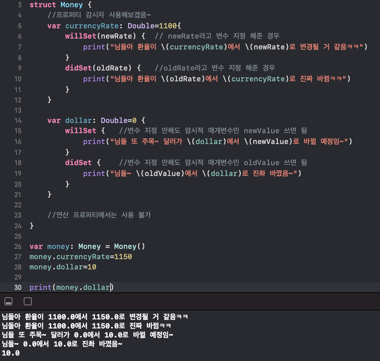 위 코드에서 암시적 매개변수 존재를 어떻게 어떤 상황에서 쓰는지 주목하자. 그리고 willSet과 didSet이 어느 타이밍에서 어떻게 구현되는지도 주목하자.
