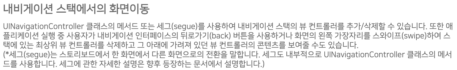 내비게이션 스택은 내가 알고 있는 stack의 개념과 동일하다. 스택에 요소를 추가하면 최상단에 그 요소가 쌓이고 이전의 것들은 스택에 담겨있다. 다만, 여기서 주의할 점은 스택을 맨 처음 생성할 때 최하단에 루트 뷰 컨트롤러가 존재해야 한다