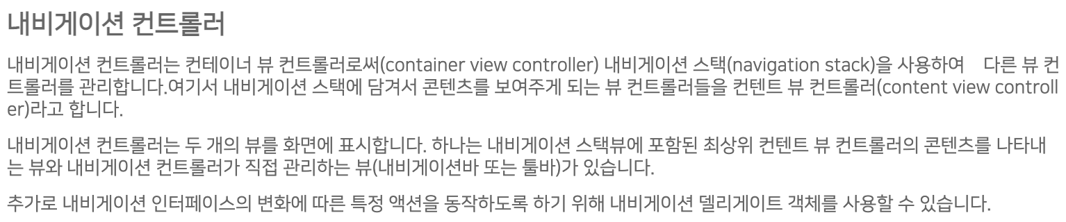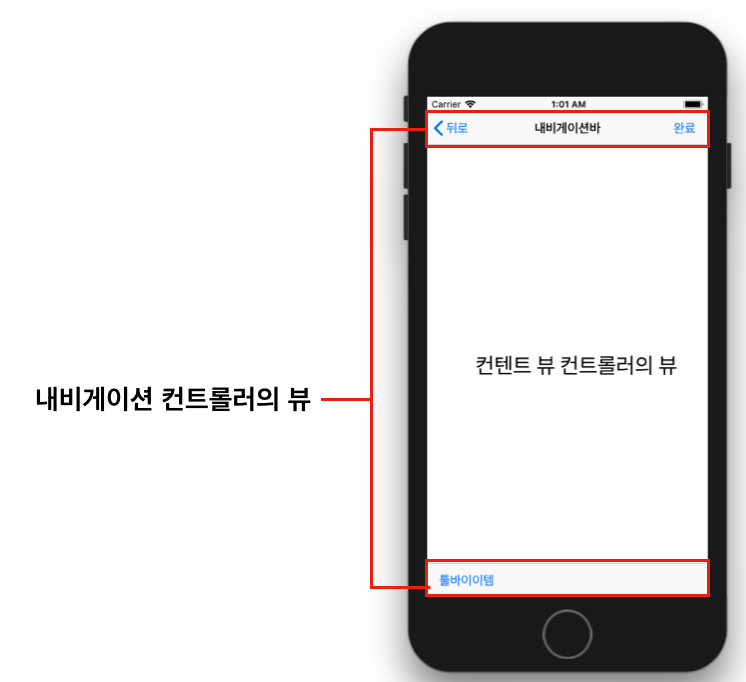내비게이션의 컨트롤러는 2가지 뷰 요소를 화면에 띄운다 -> 컨텐트 뷰 & 내비게이션 바