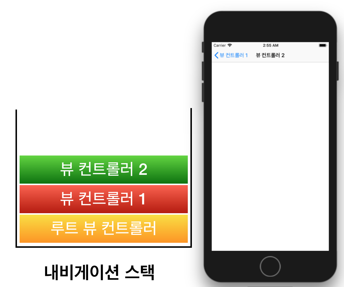 화면 이동 시 새로운 화면으로 가면 스택에 뷰 컨트롤러2가 쌓인다. 그리고 이전 화면으로 가면 스택에서 뷰 컨트롤러2가 pop(삭제)되고 뷰 컨트롤러1의 화면이 나온다. (맨 밑에는 루트 뷰 컨트롤러가 존재한다)